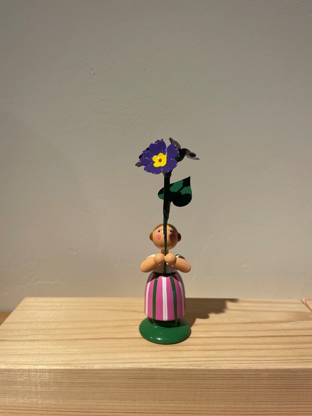ジャン・レグラー社のフラワーチャイルド 紫の花です。 丁寧に塗り重ねられた塗装が美しい小さな人形です。 持っているお花に合わせた可愛らしい服を身に着けて、 帽子をかぶってちょっと太めの手足で、小さなこどもを連想させます。 すべて木で作られています。 花びらや葉っぱなどはとても繊細で壊れやすいので、小さな子どもには不向きです。 繊細なものをやさしく扱える年齢のお子さんや大人の方のお部屋飾りとしてお使いください。 人形の大きさ 約6㎝ 全体の大きさ 約8㎝