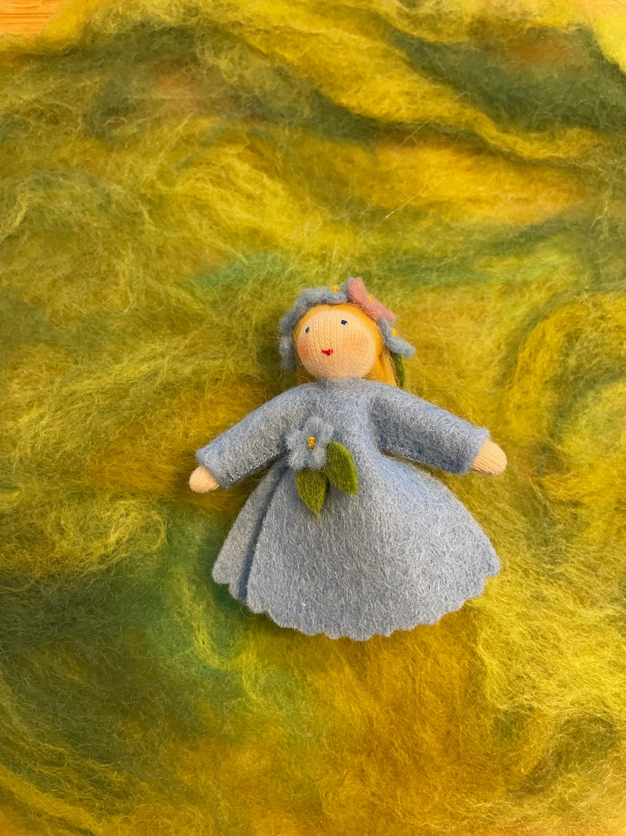 フェルトで作られた約8センチの小さな勿忘草(わすれなぐさ)です。