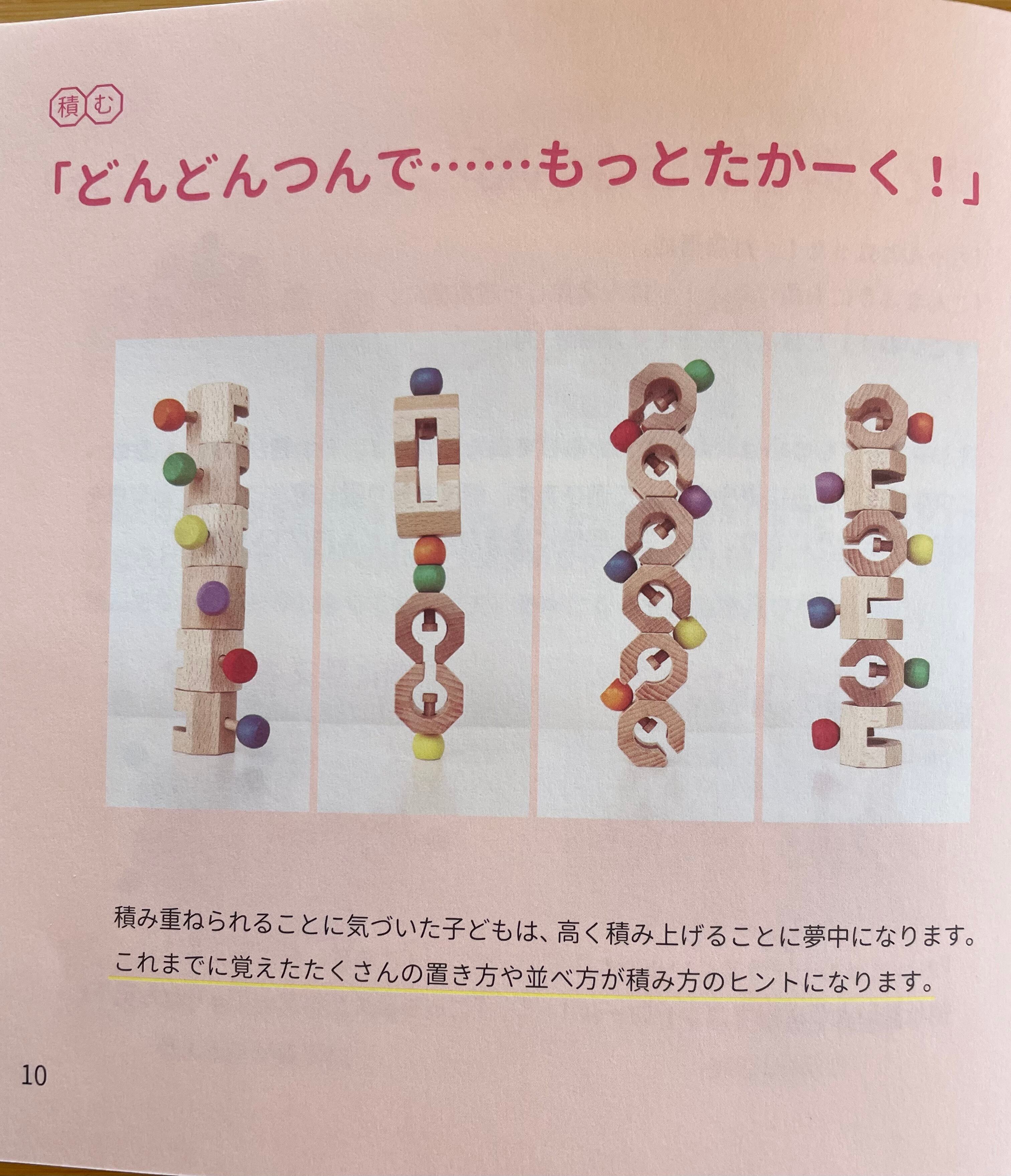 並べたり、積んだり、つないだり。つないだものを動かしたり、見立てて遊んだり、穴の中を覗いてみたり、振ると音がなったり…。