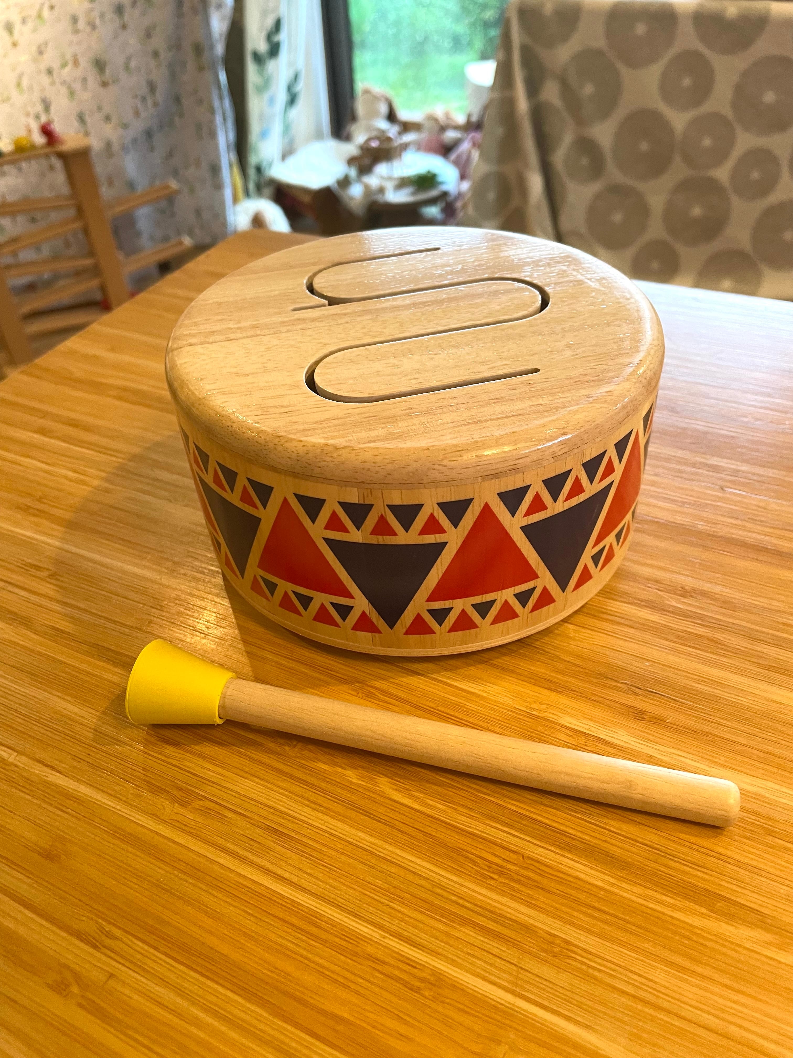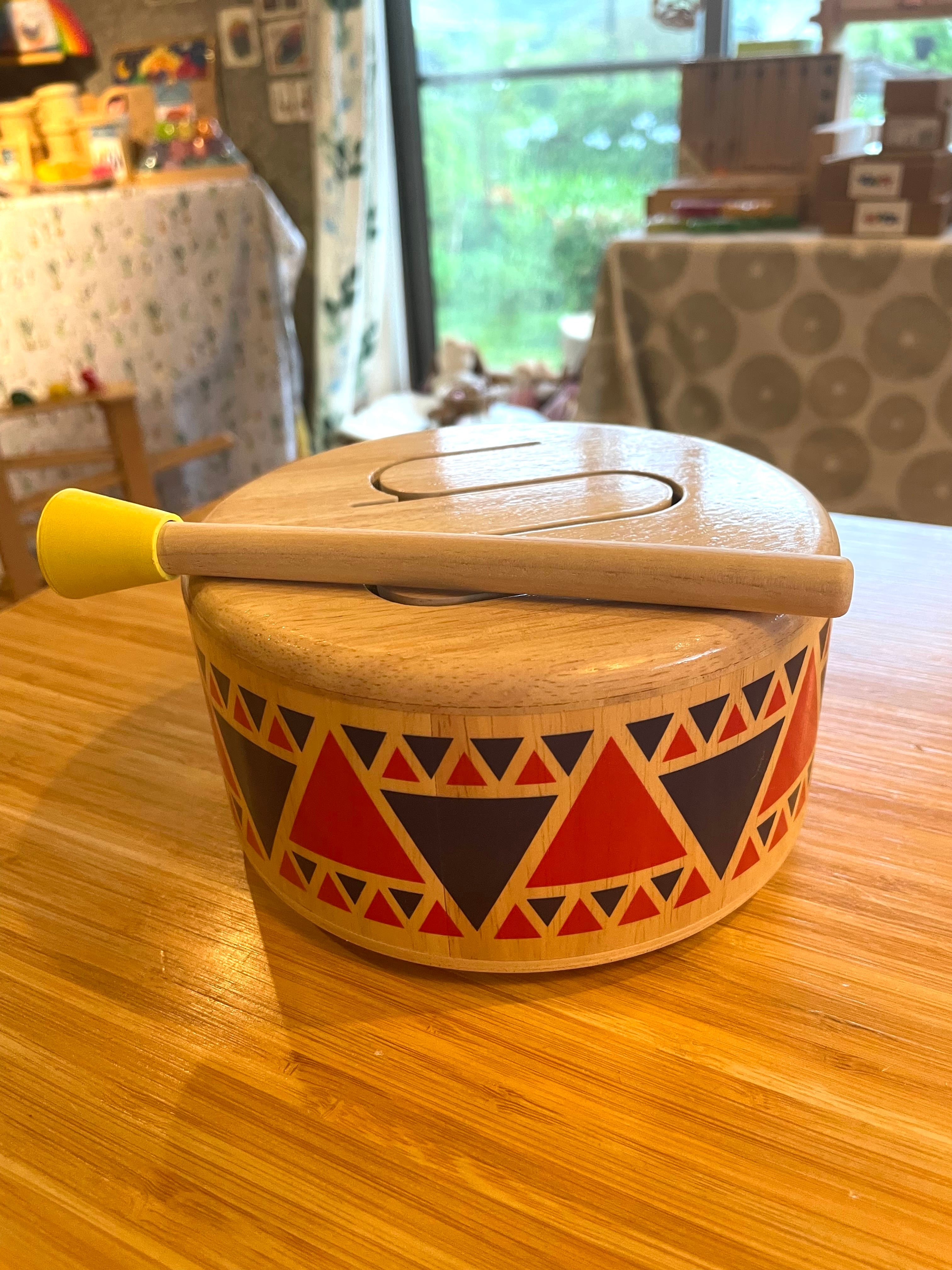 打面がしっかりした木製のドラム。はげしくたたいても壊れにくいのが特徴です。
