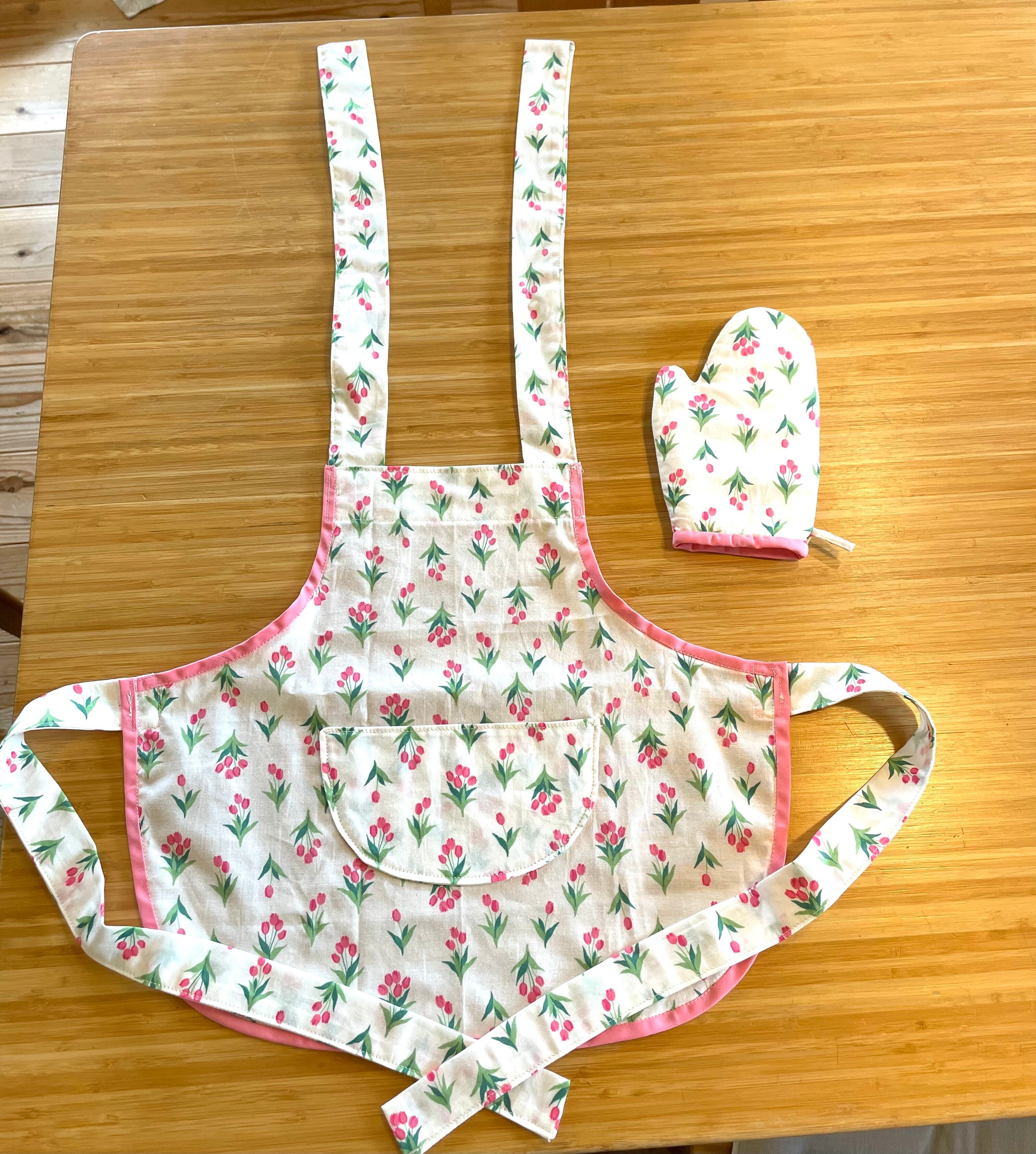 子ども用のエプロンとミトン(チューリップ柄)です。