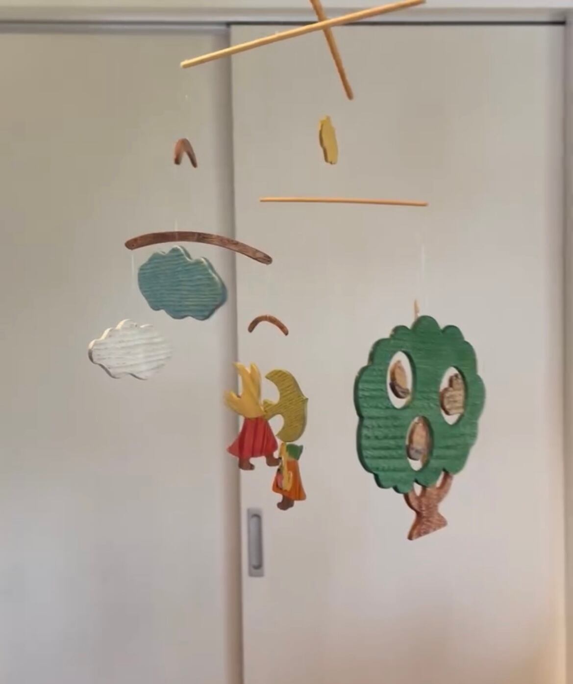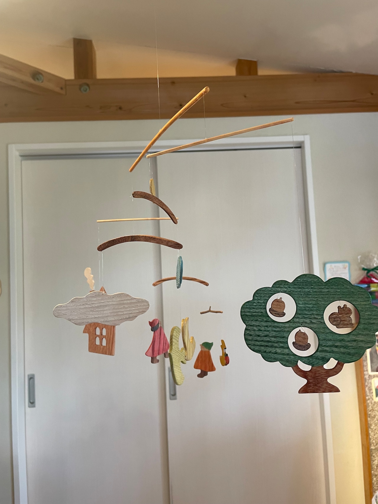どんぐりの木、雲、鳥たち、人、キツネ、リスなど森の動物をモチーフにした素敵なモビールです。