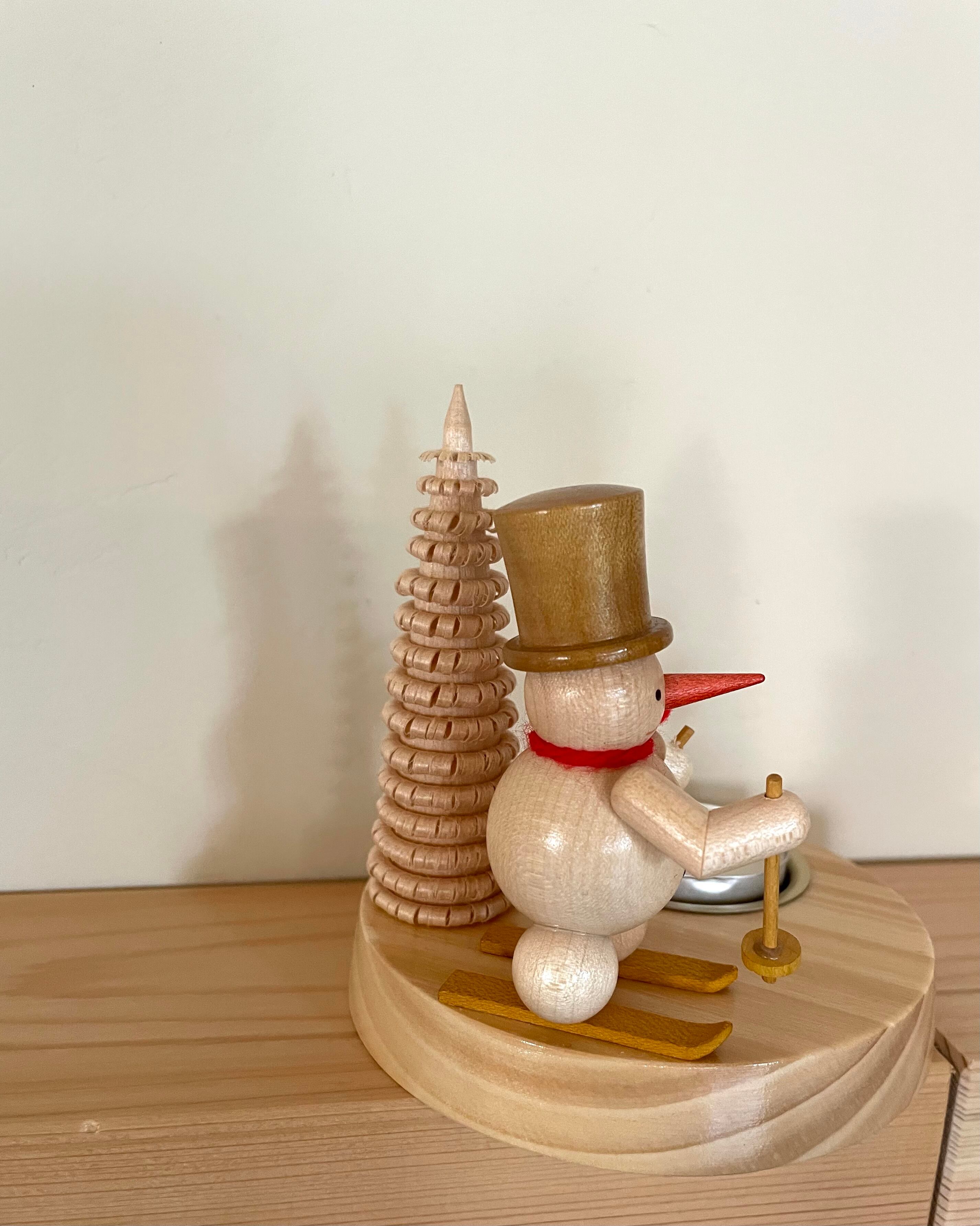 スキーをしているスノーマンと木のティーライトホルダーです。