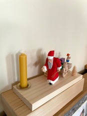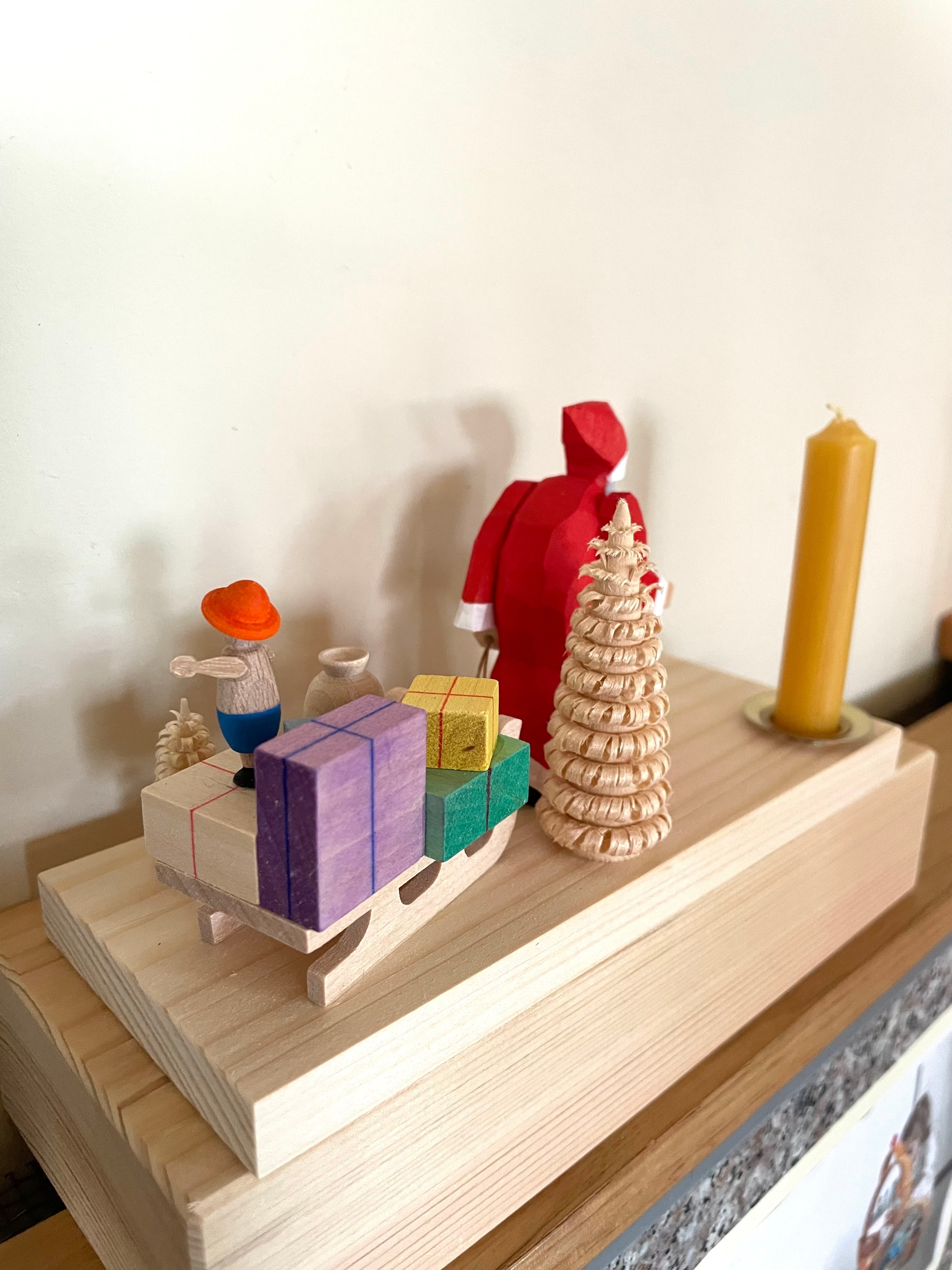 プレゼントを載せたそりをひくサンタのキャンドルスタンドです。