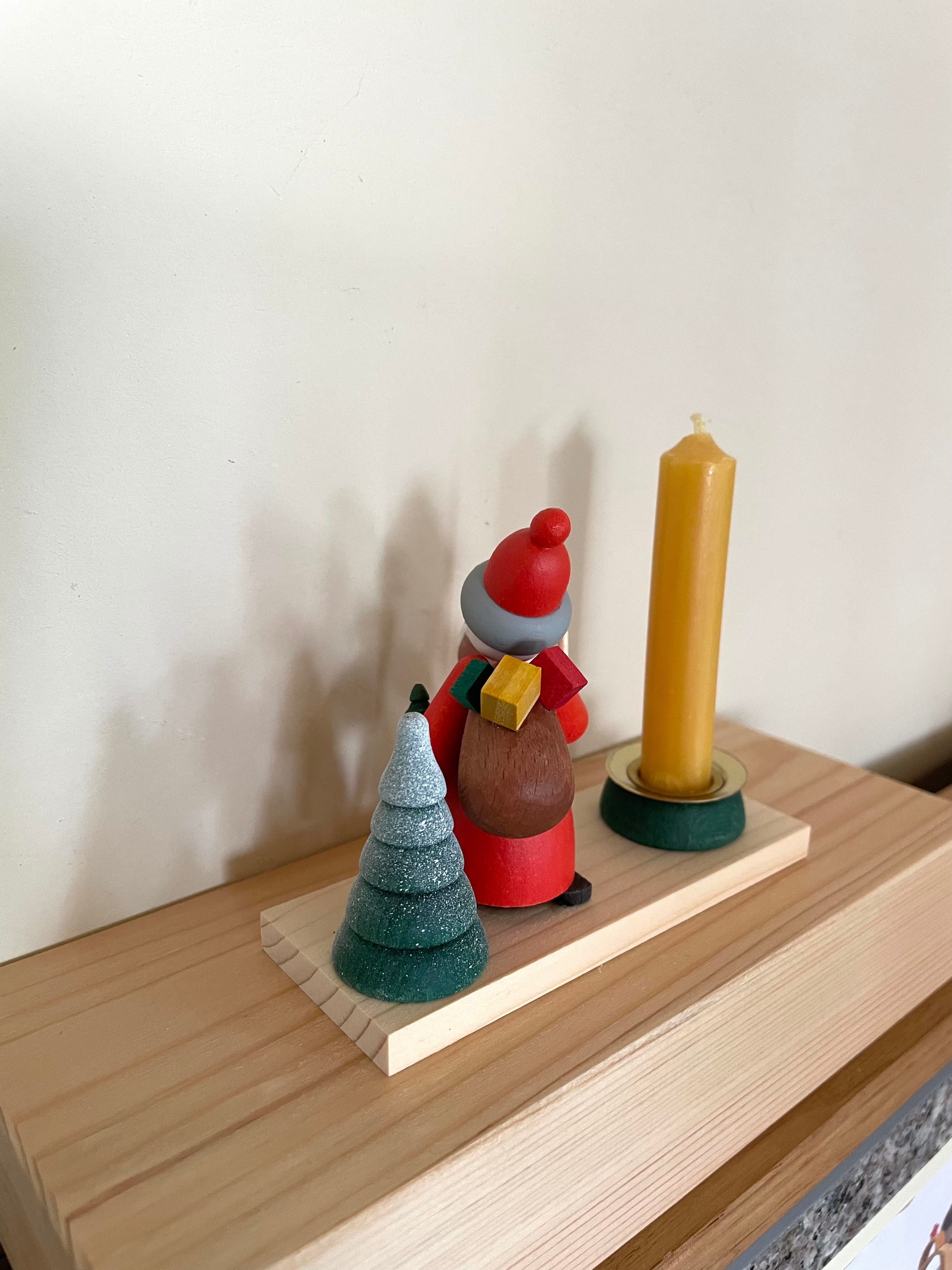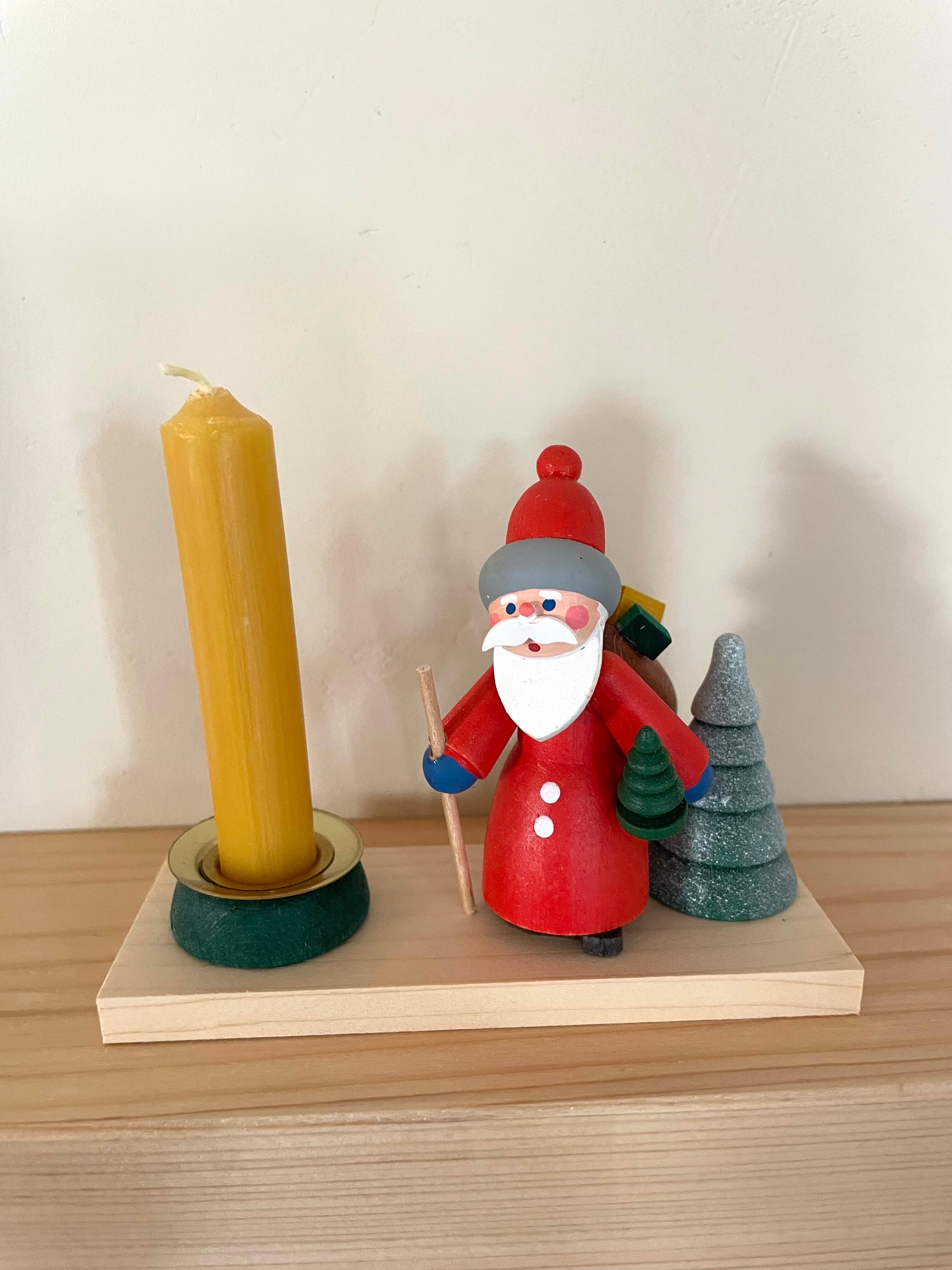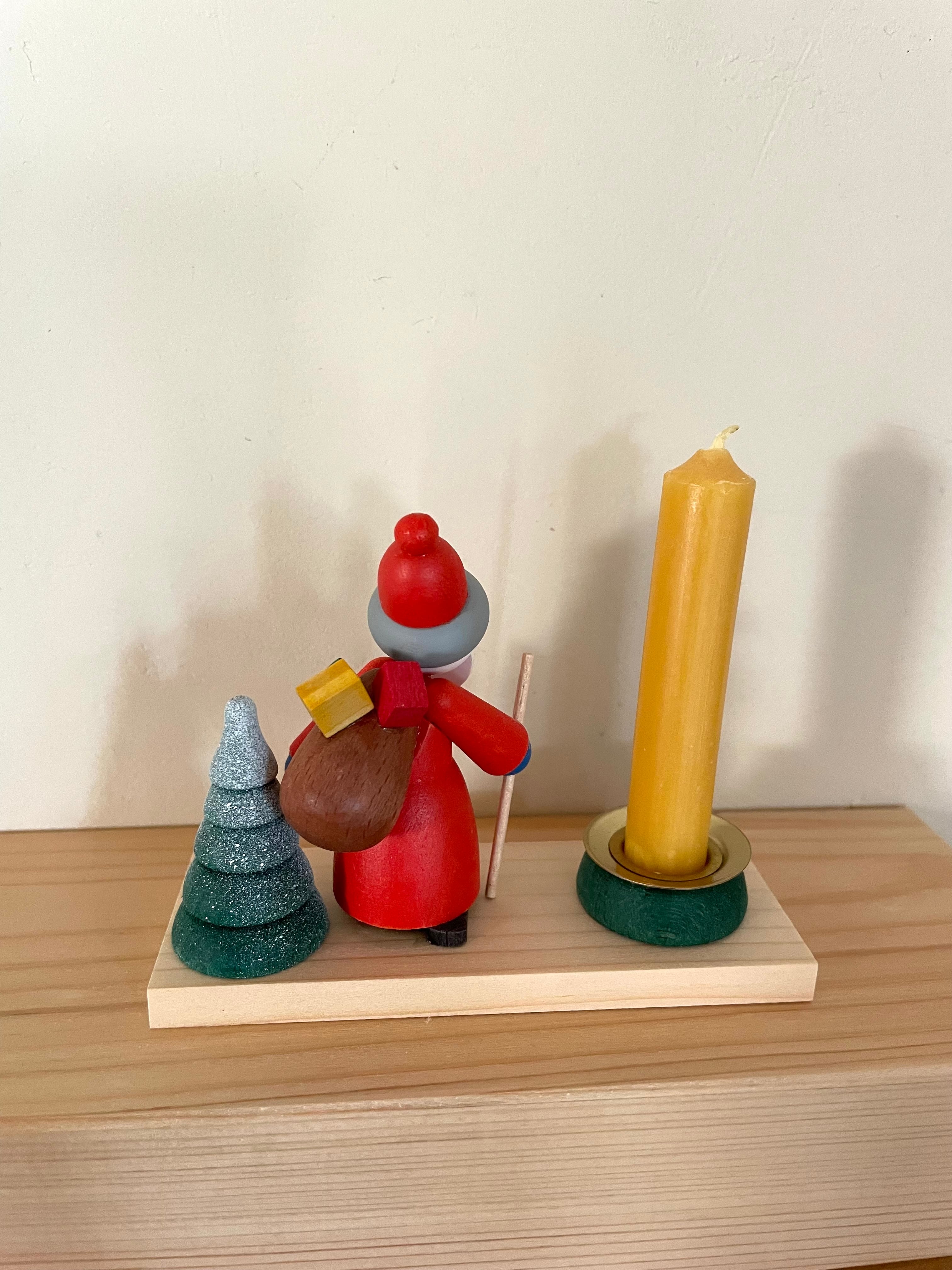 プレゼントの袋を持つサンタ、もみの木が付いたキャンドルホルダーです。
