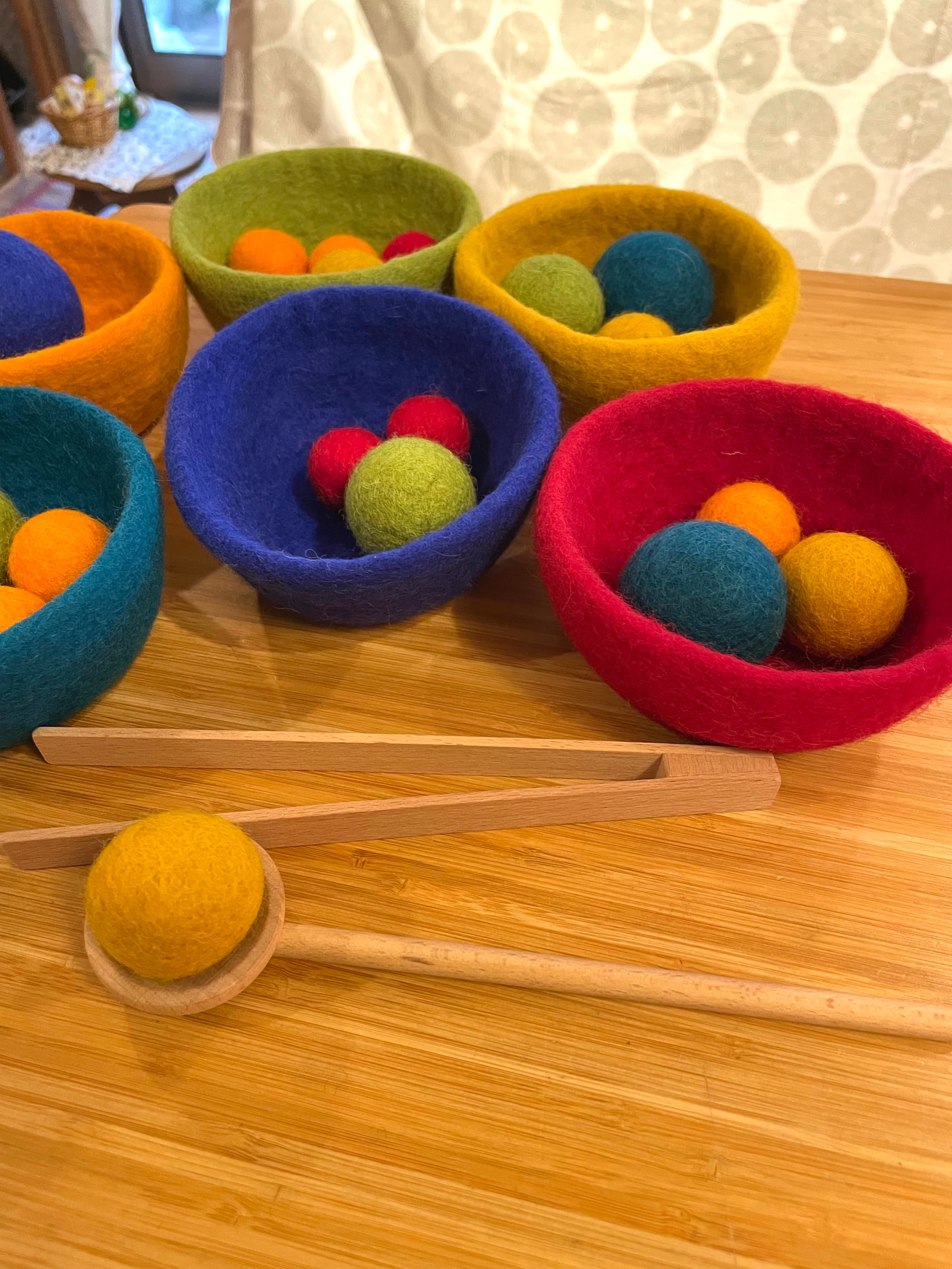 柔らかい羊毛カップや羊毛ボールは、手触りもよく小さなお子様にも遊びやすいんじゃないかなと思います。おままごとやごっこ遊びに。