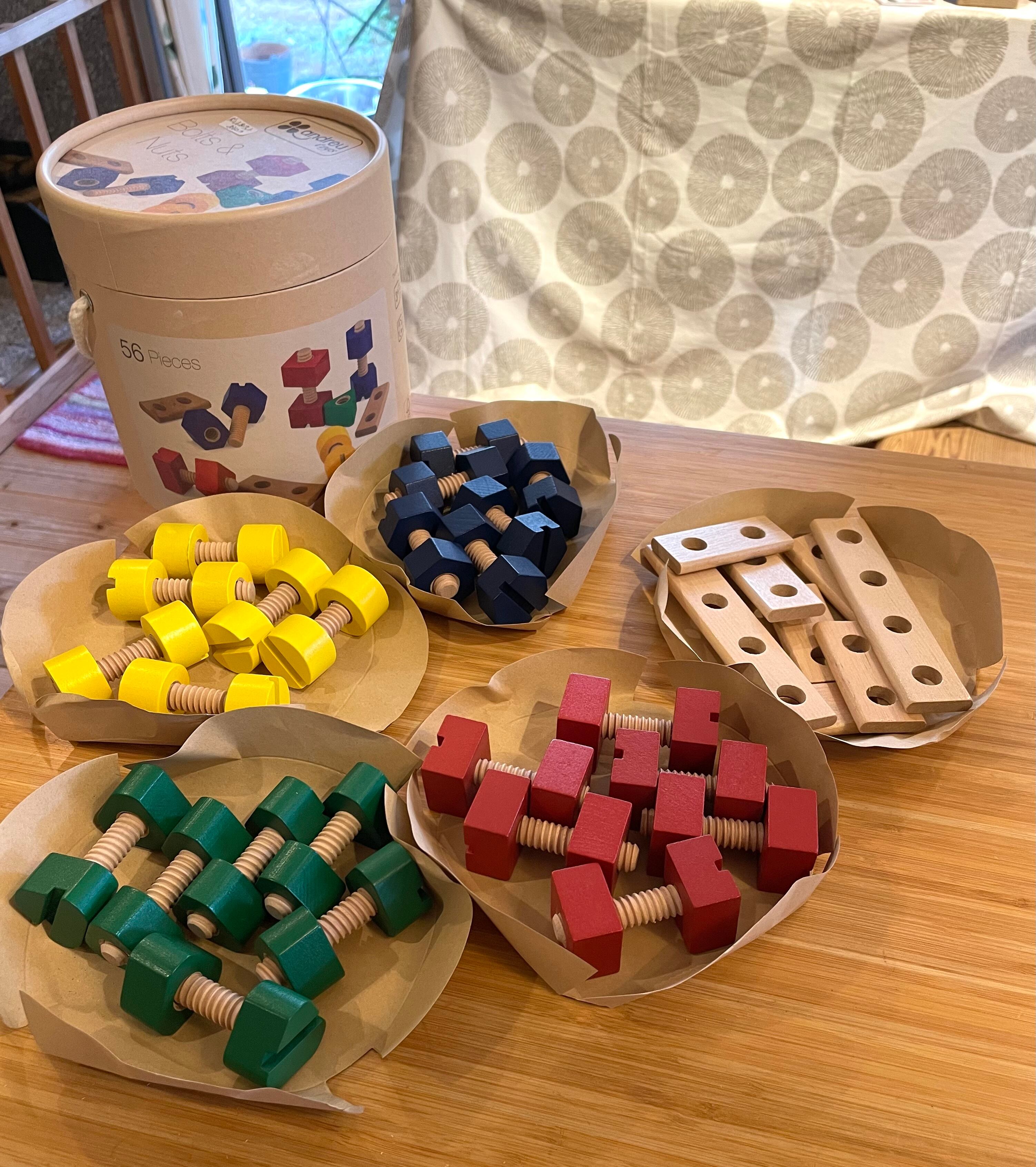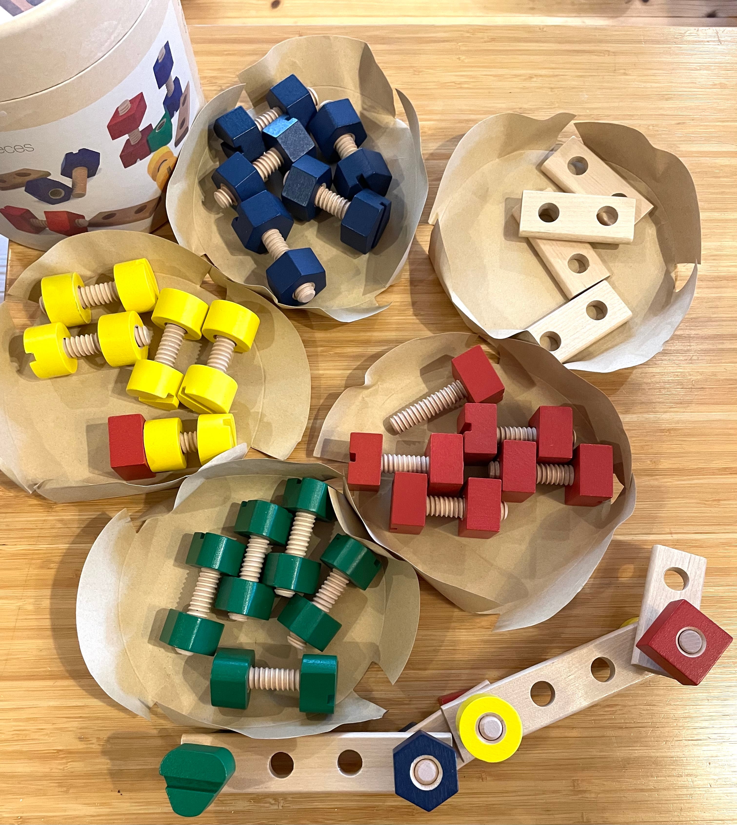 赤(四角)、青(六角形)、緑(三角形)、黄色(円形)のボルトとナットが6個づつ入っています。回転させながらナットを外したり、入れたりして遊びます。