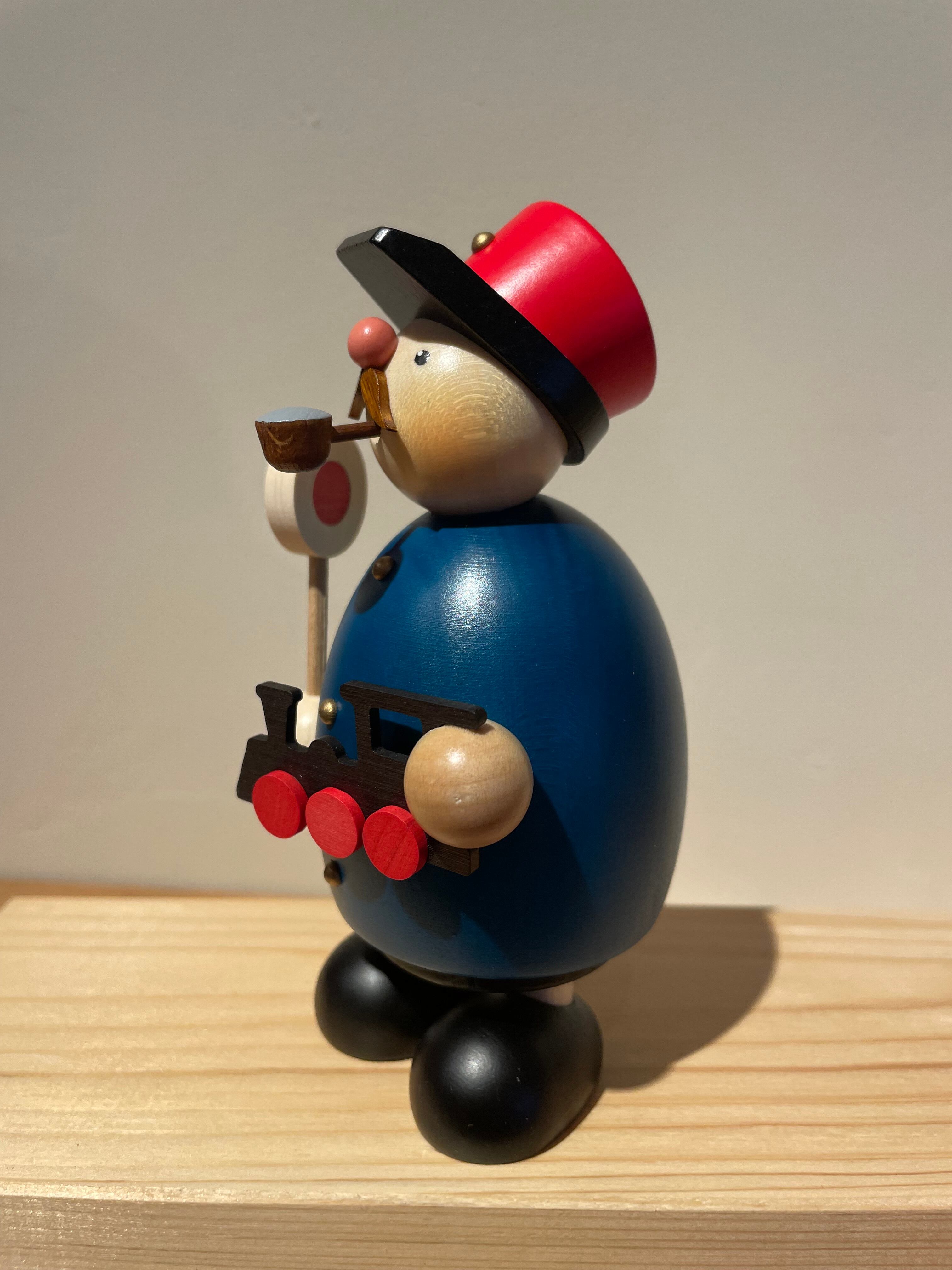 落ち着いた紺色の服、つばの付いた赤い帽子に口元にはパイプ。黒い靴を履いて、片手に汽車、片手に信号機(裏表色が違います…表側は緑、裏側は赤)を持っています。