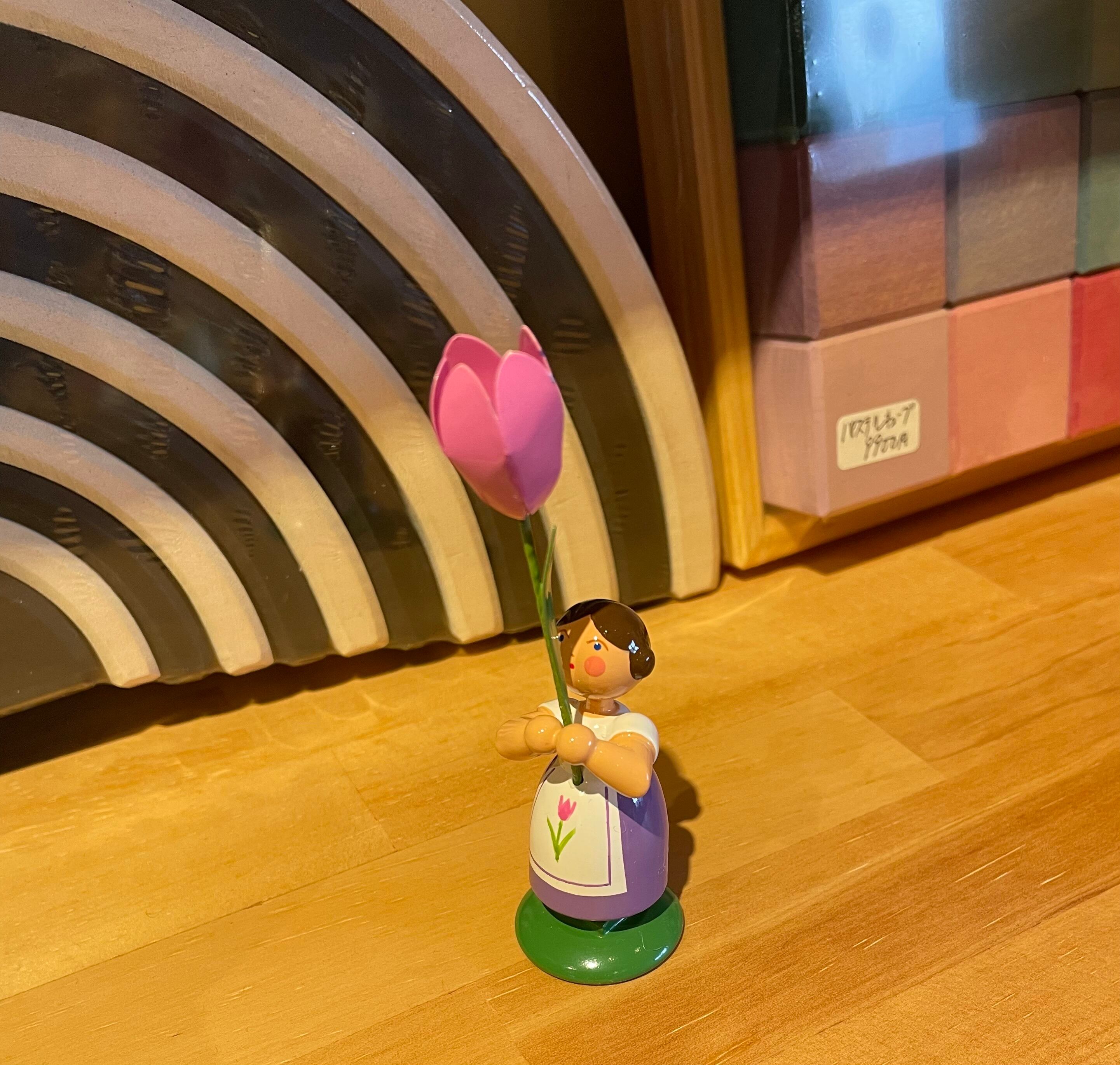 掲げたお花を見つめているデザインも、小さな子どものしぐさを連想させます。