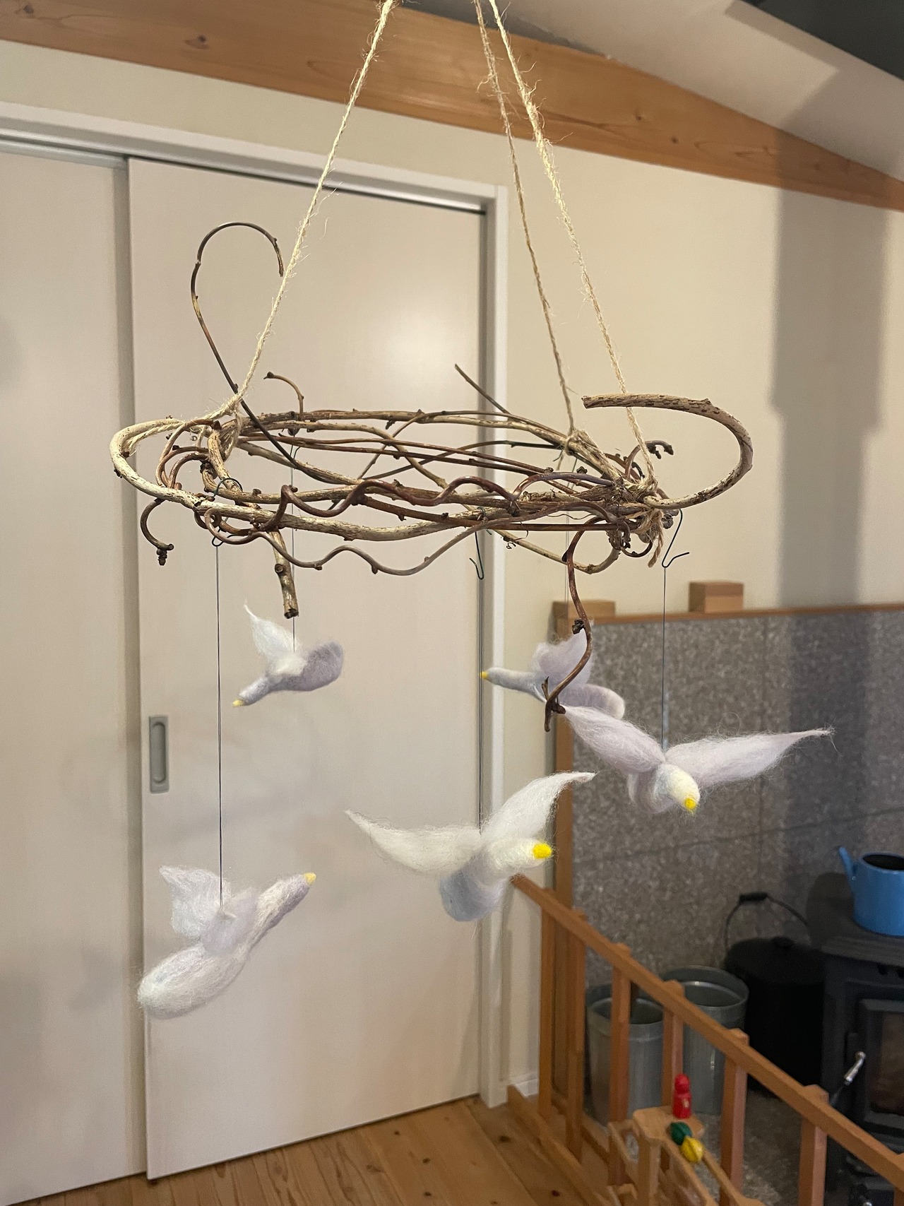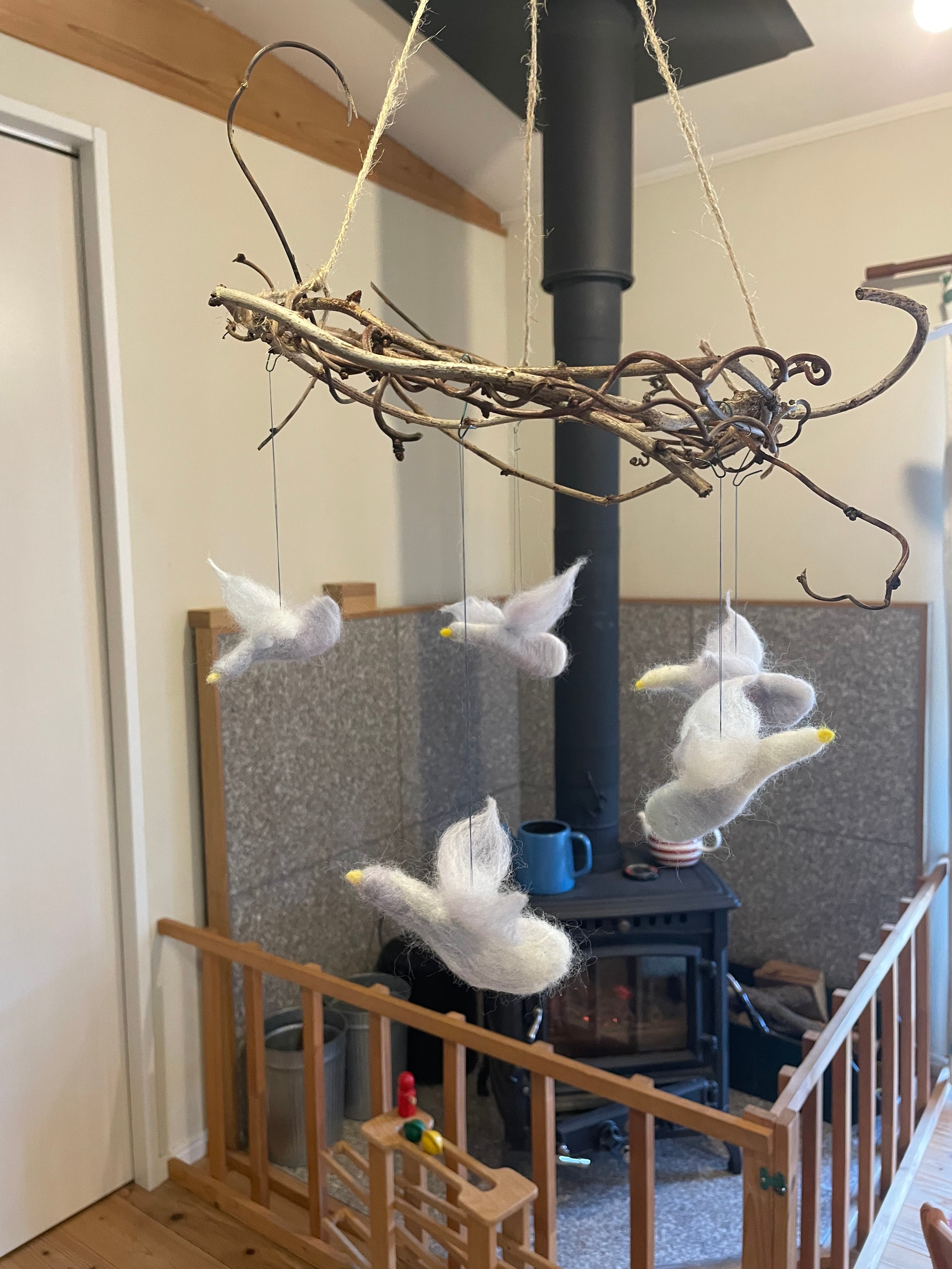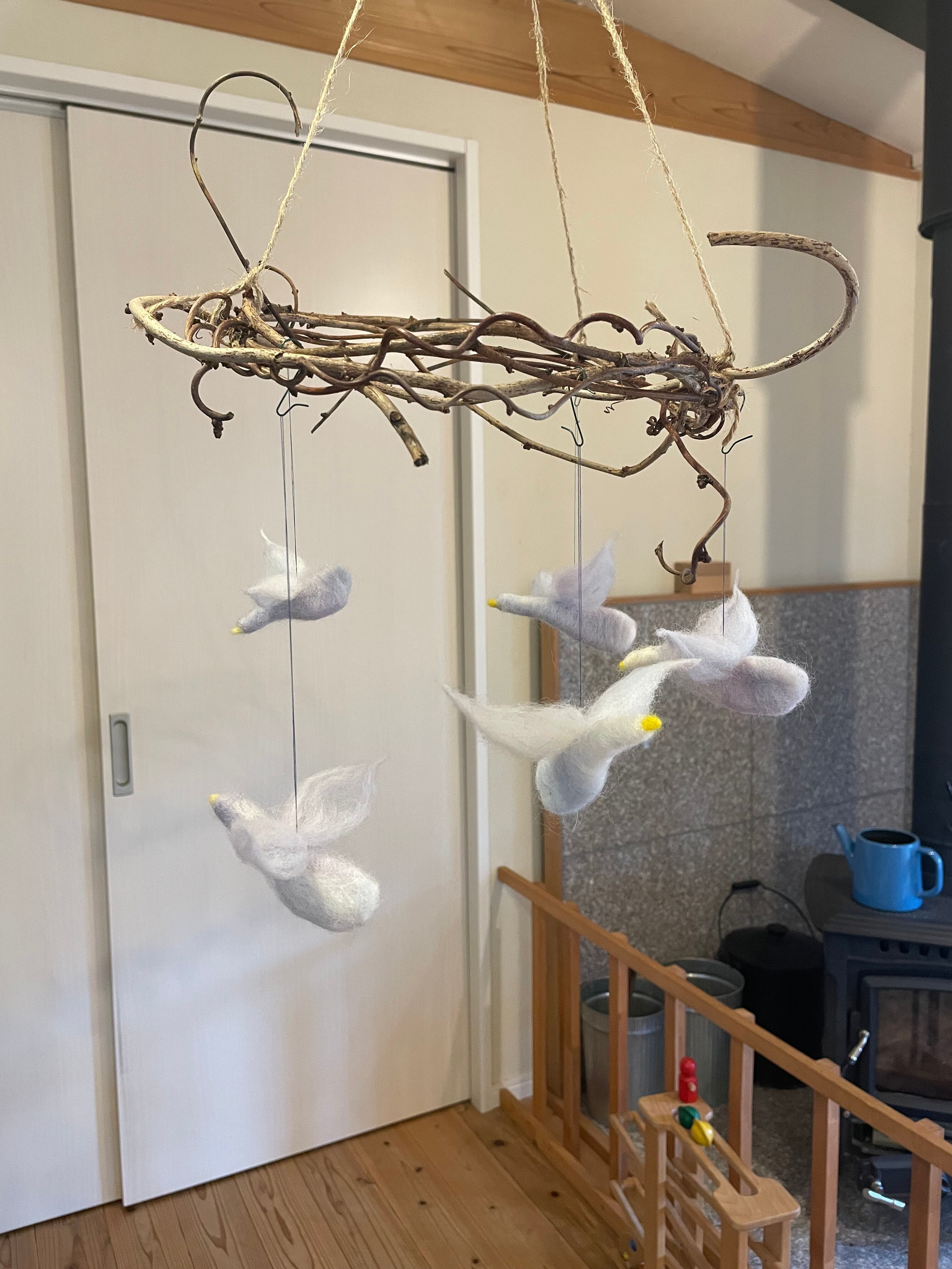 羊毛の柔らかさをいかして、フェルティングニードルで刺し固めず、ふんわりとして白い鳥の群れをイメージしています。どこまでも飛んでいけそうな鳥たちです。