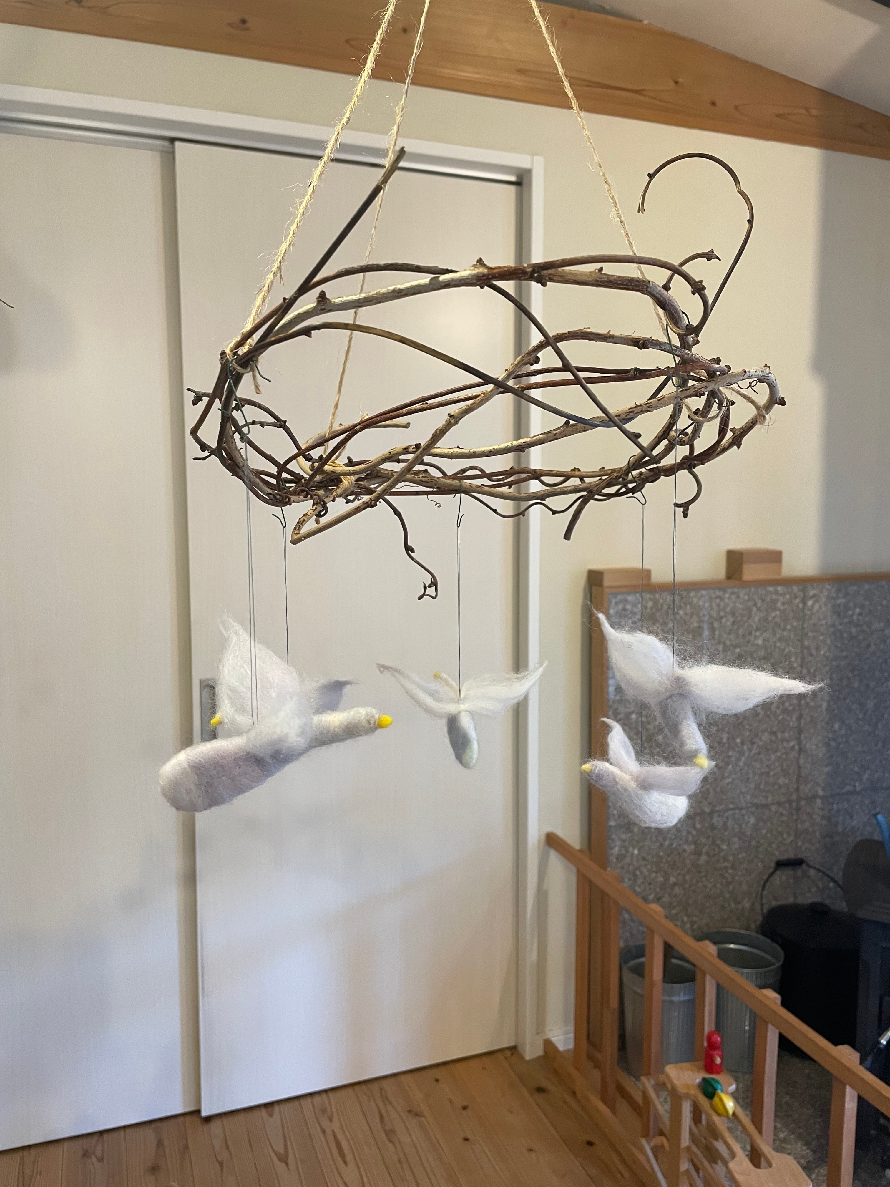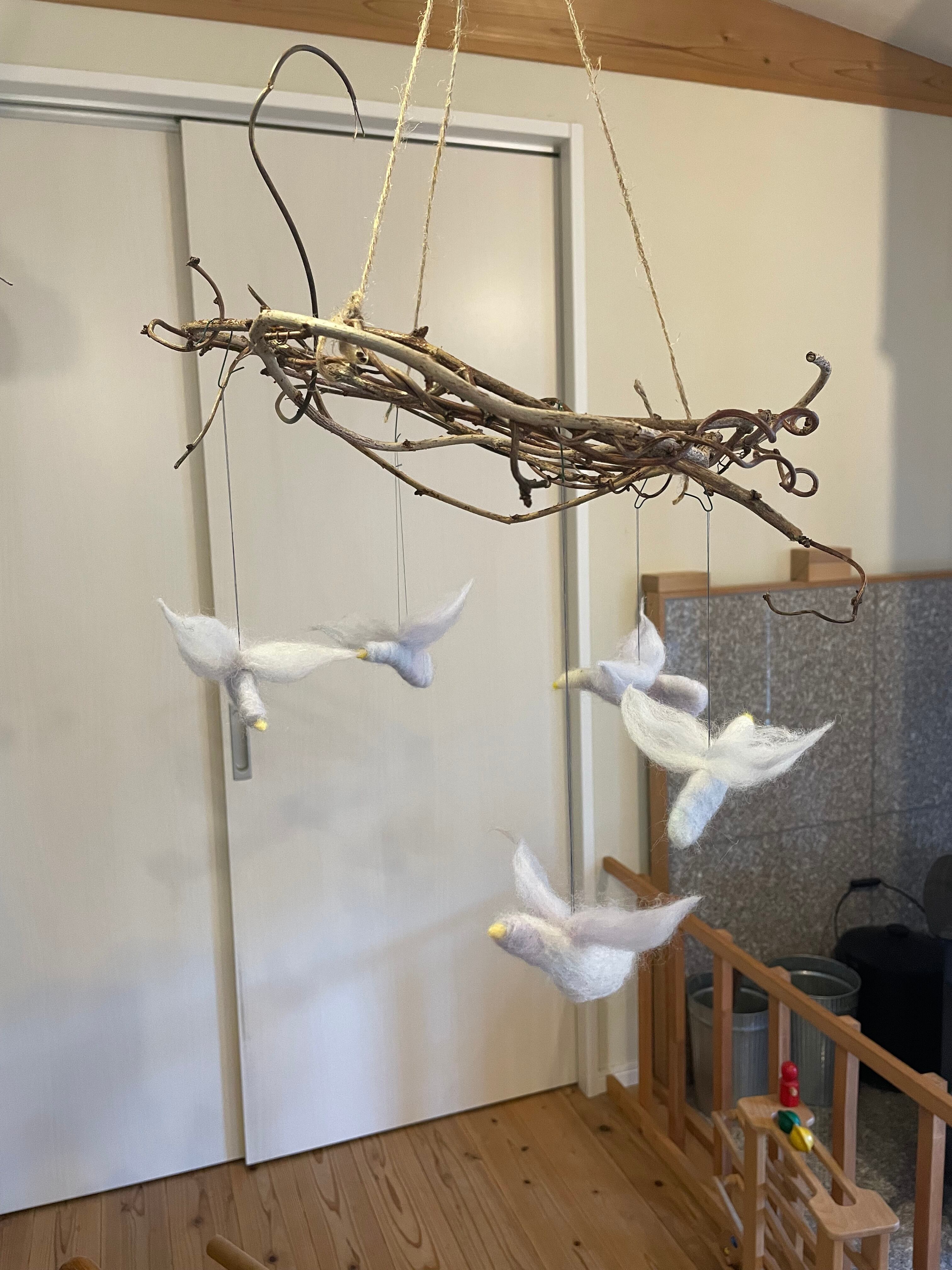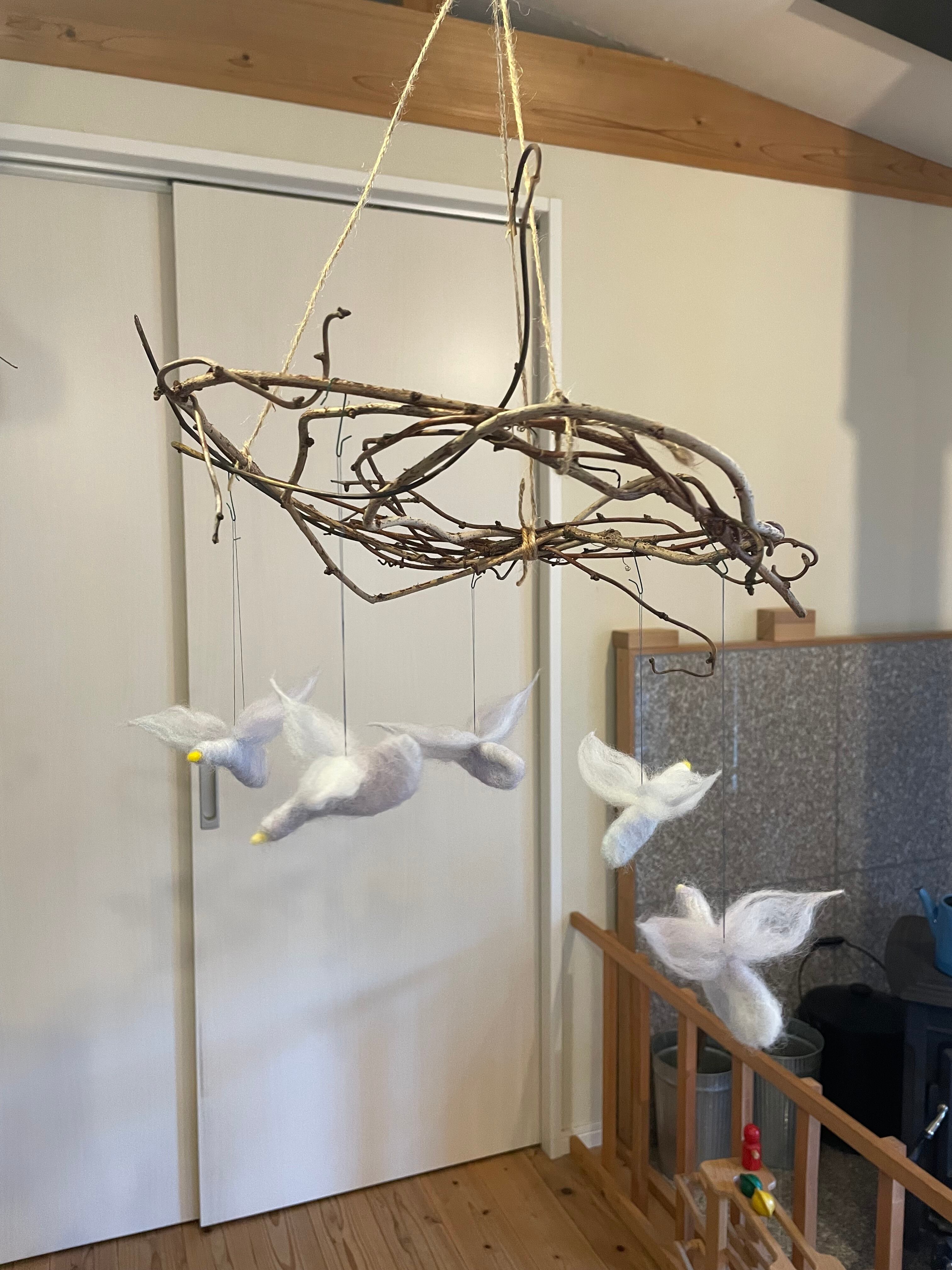 羊毛の柔らかさをいかして、フェルティングニードルで刺し固めず、ふんわりとして白い鳥の群れをイメージしています。どこまでも飛んでいけそうな鳥たちです。