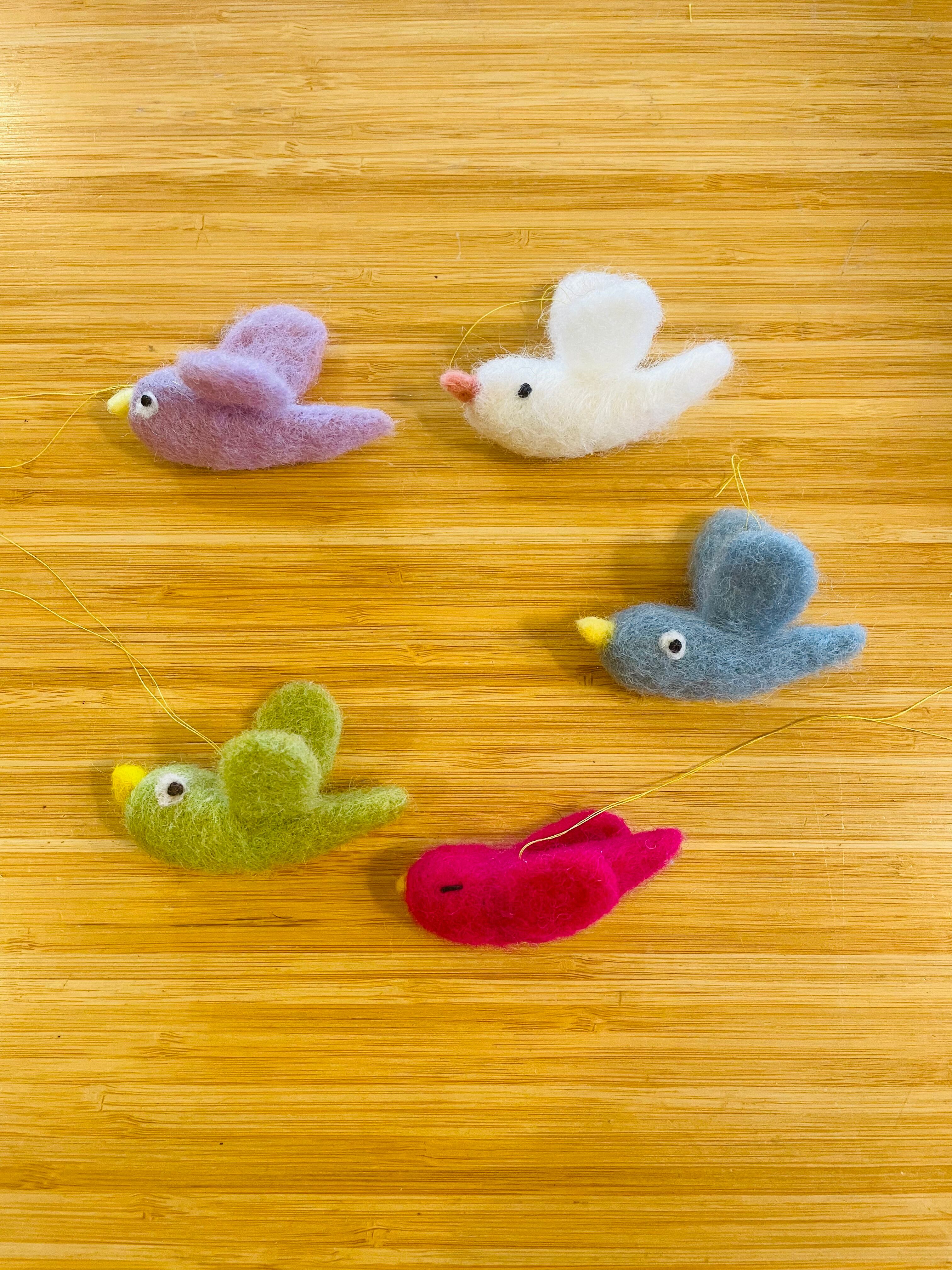 春の訪れを喜び、飛び回る小さな色とりどりの鳥たちを作りました。