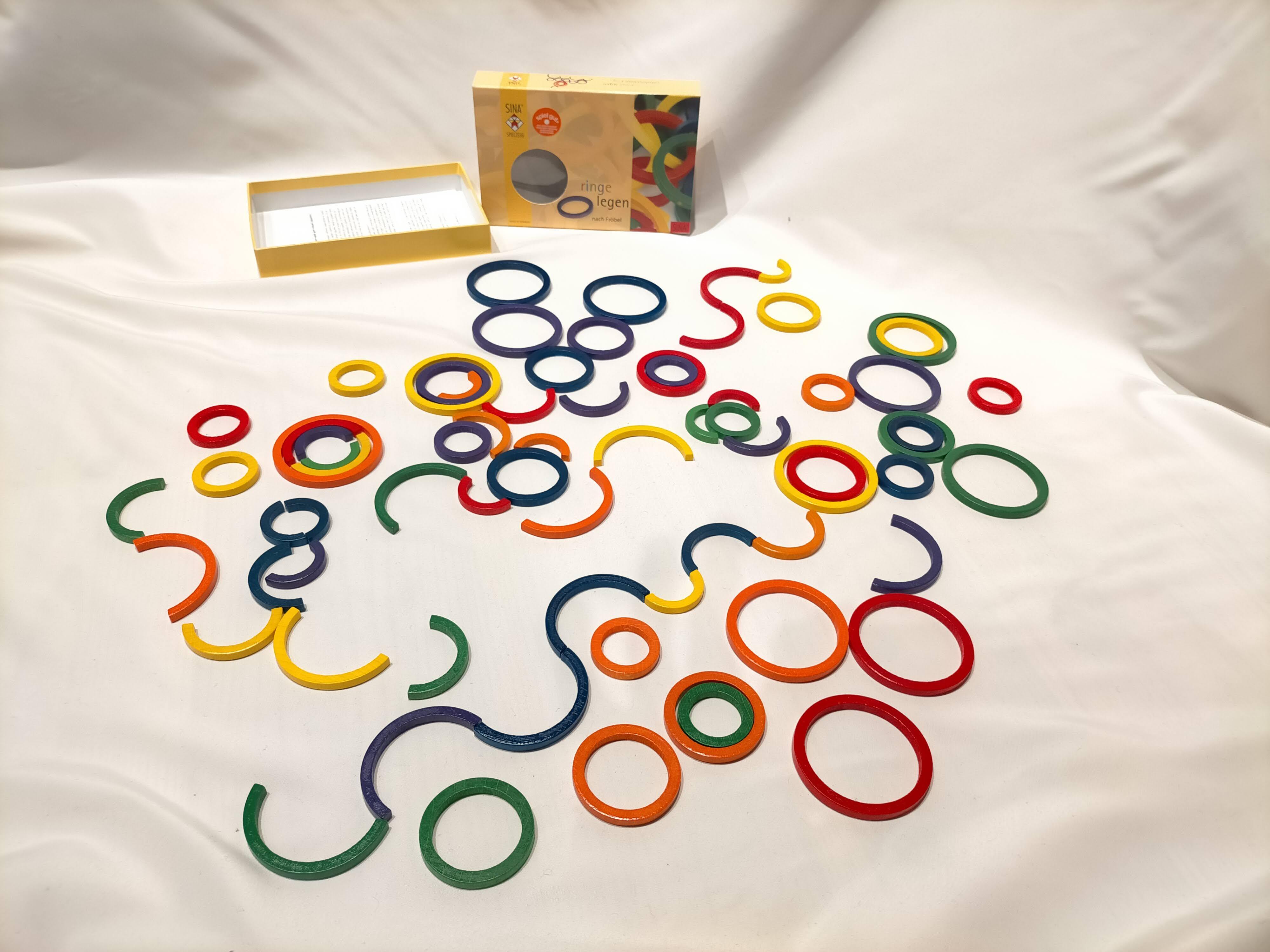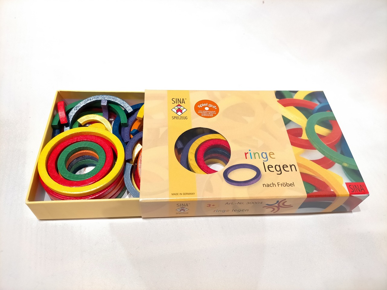 フレーベルの理論を、系統立てて商品化しているドイツのデュシュマ社、ジーナ社のモザイクシリーズの一つ。リングと円弧の細いパーツは木製ながら、高度な技術で丁寧に作られています。立体的に並べることもできます。大きさはφ34,46,60㎜の3種類。厚み5㎟。