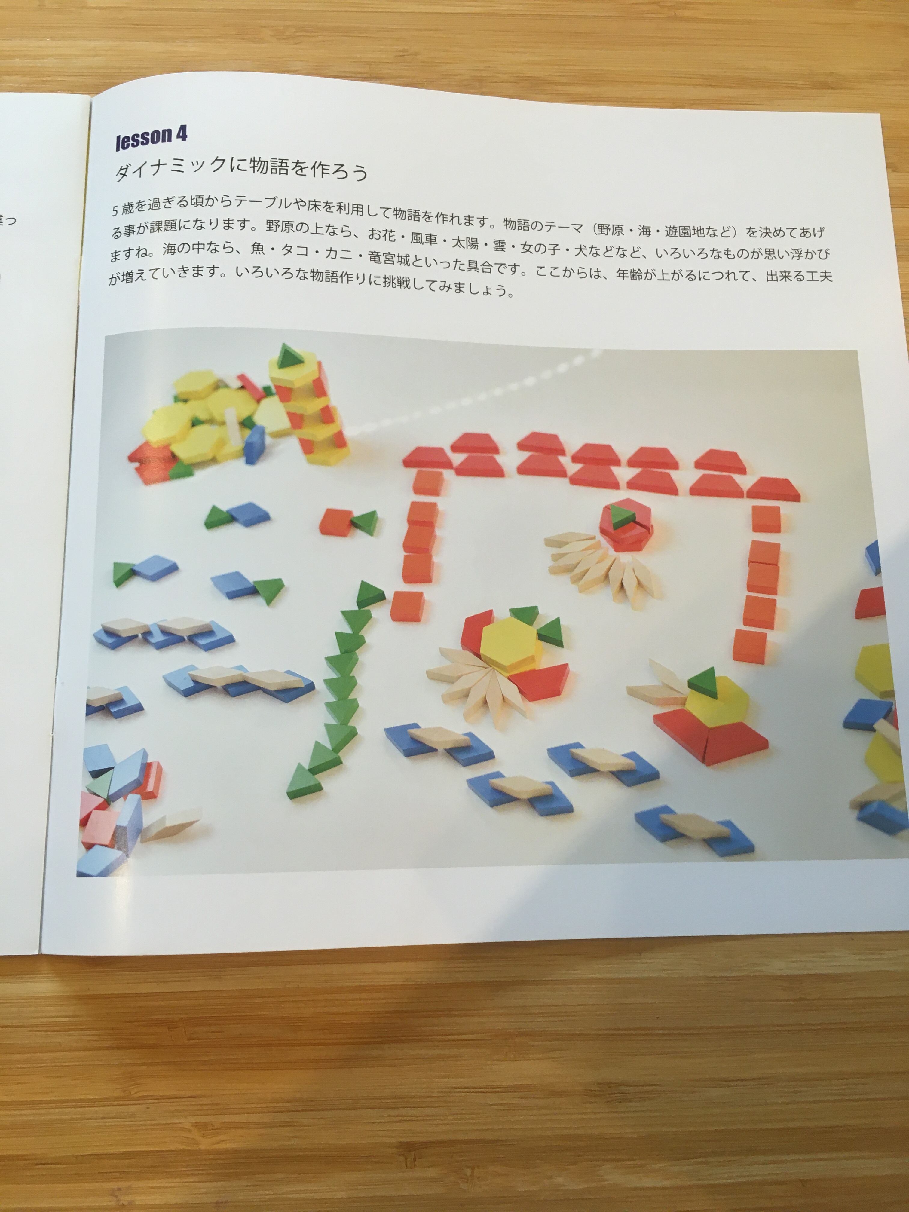 自由に形や模様を作ってあそんだり、厚みがあるので,平面的に置くだけでなく、立体的に立てて遊ぶこともできます。
