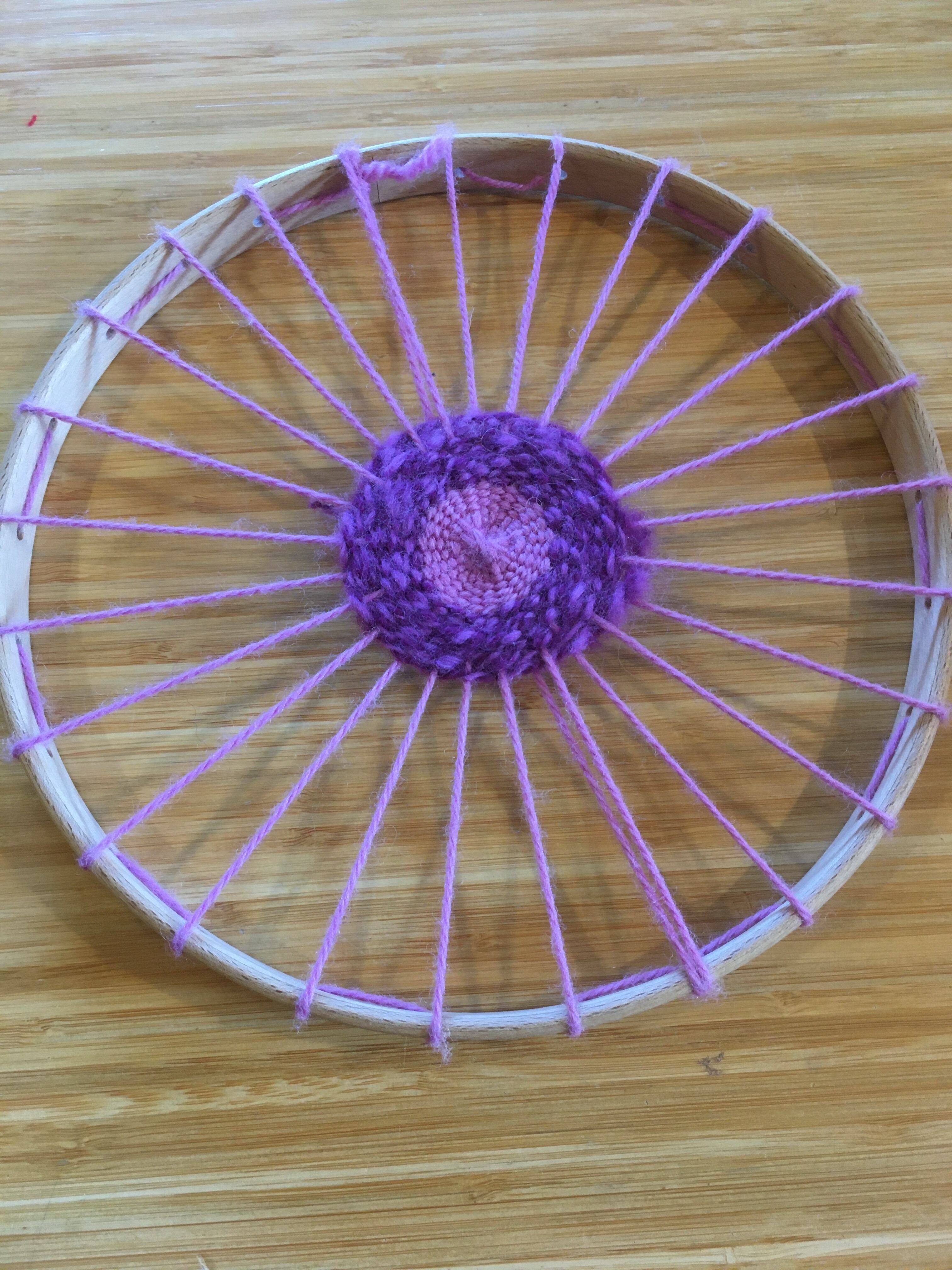 放射状に張った糸の中心から、外に向かって毛糸を通してゆきます。