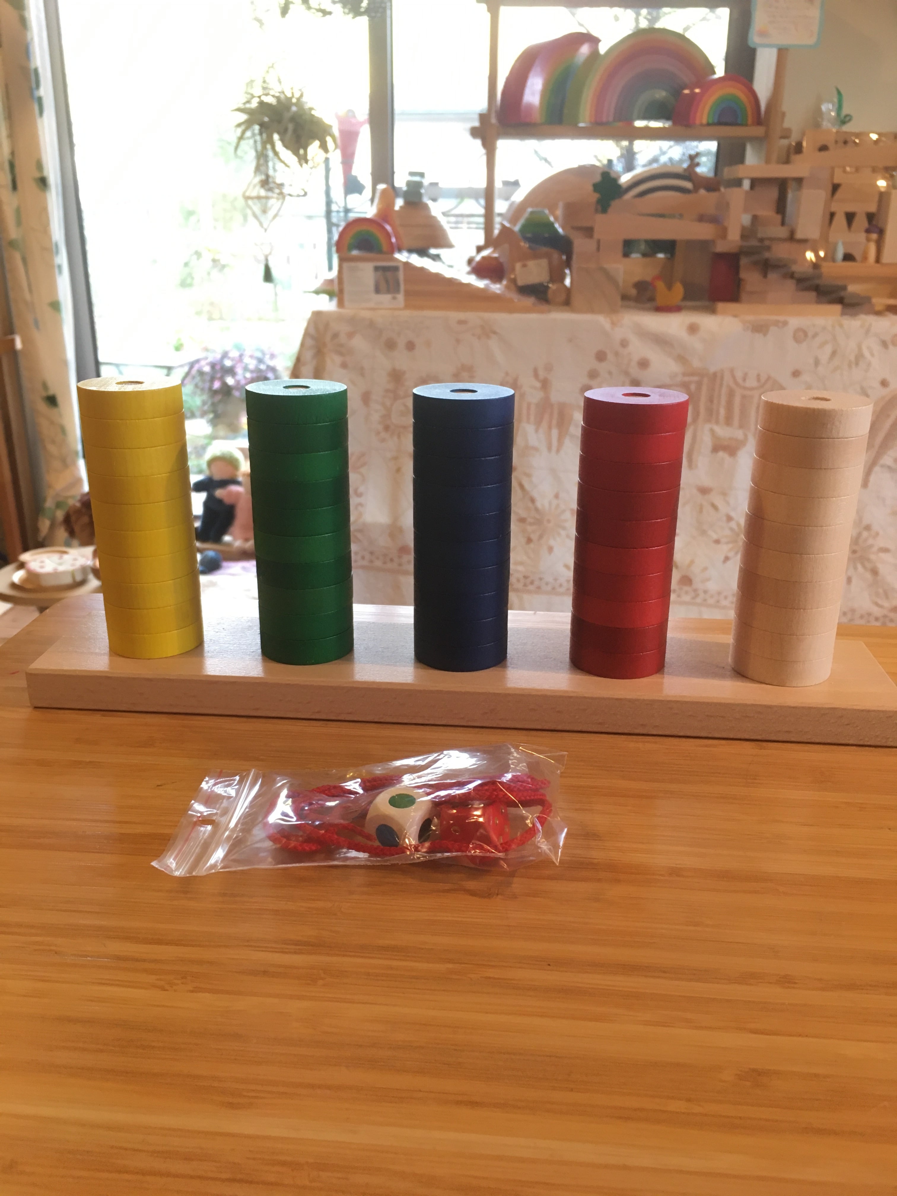 色のサイコロと数のサイコロが入っているので、簡単なゲームをすることもできますよ。
