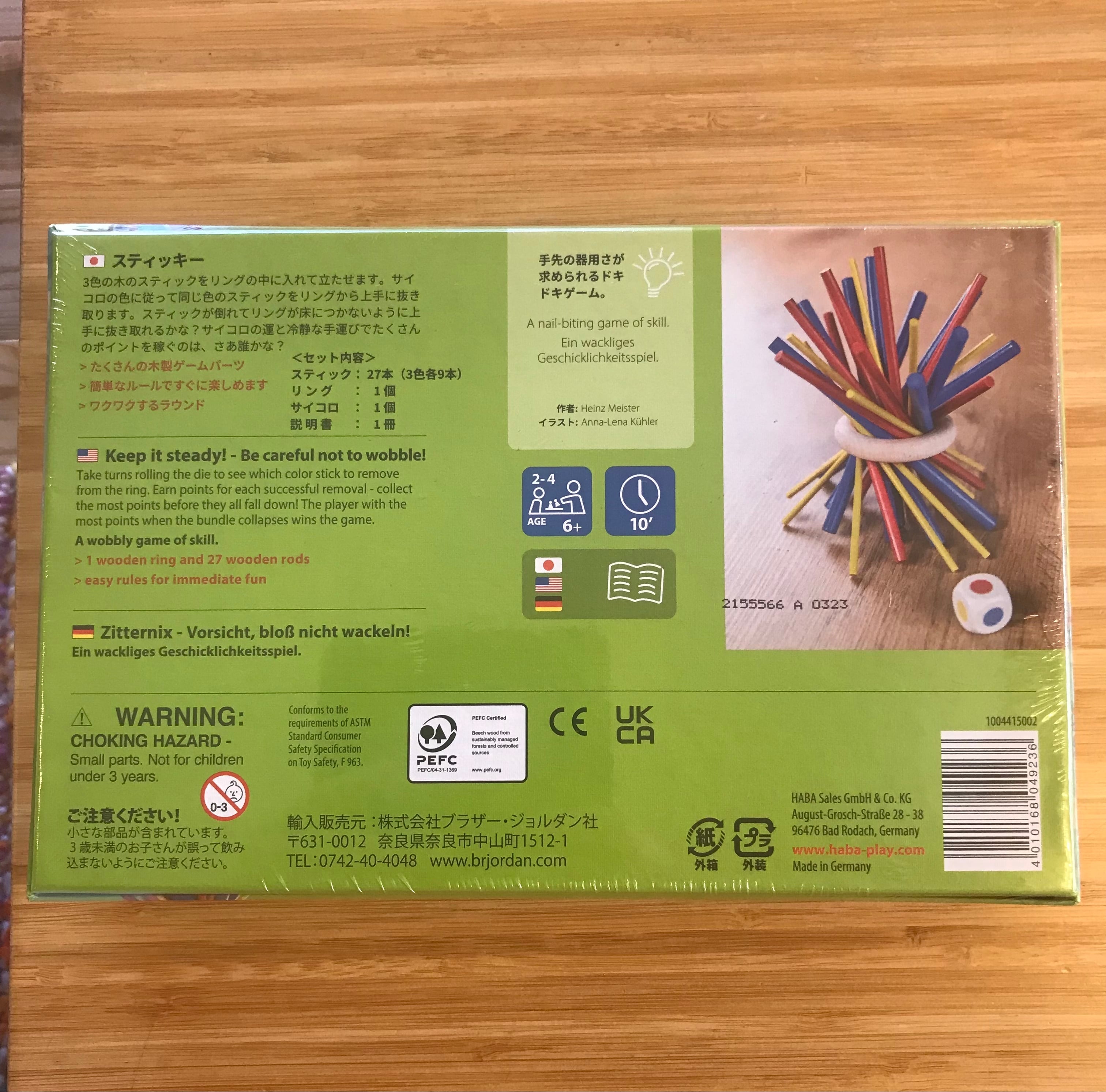 リングで束ねられた、スティックを崩さないように抜き取っていくバランスゲームです。
