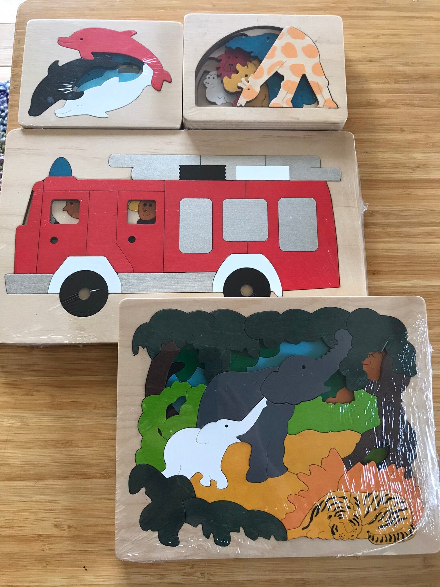 5種の異なるモチーフを1枚板で遊べるように作られたピープパズル。少しずつピース数が増えていく3重パズル。異なる上下2層の絵柄が1枚のボードにセットされた2重パズル。など、ちいさな子ども(2歳ごろ)から、小学生の子どもまでそれぞれの年齢や興味に応じて楽しめるように作られています。
