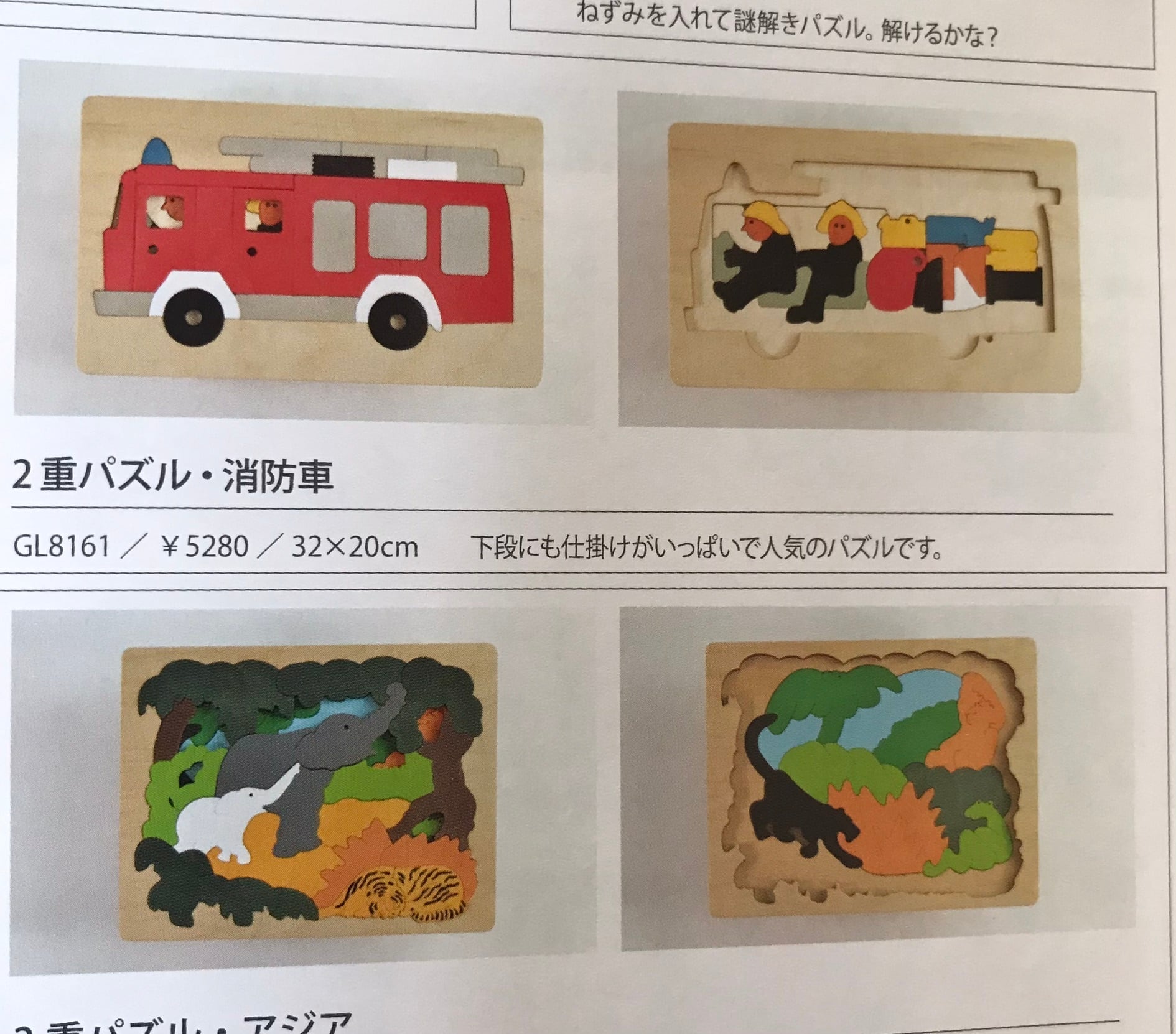 5種の異なるモチーフを1枚板で遊べるように作られたピープパズル。少しずつピース数が増えていく3重パズル。異なる上下2層の絵柄が1枚のボードにセットされた2重パズル。など、ちいさな子ども(2歳ごろ)から、小学生の子どもまでそれぞれの年齢や興味に応じて楽しめるように作られています。