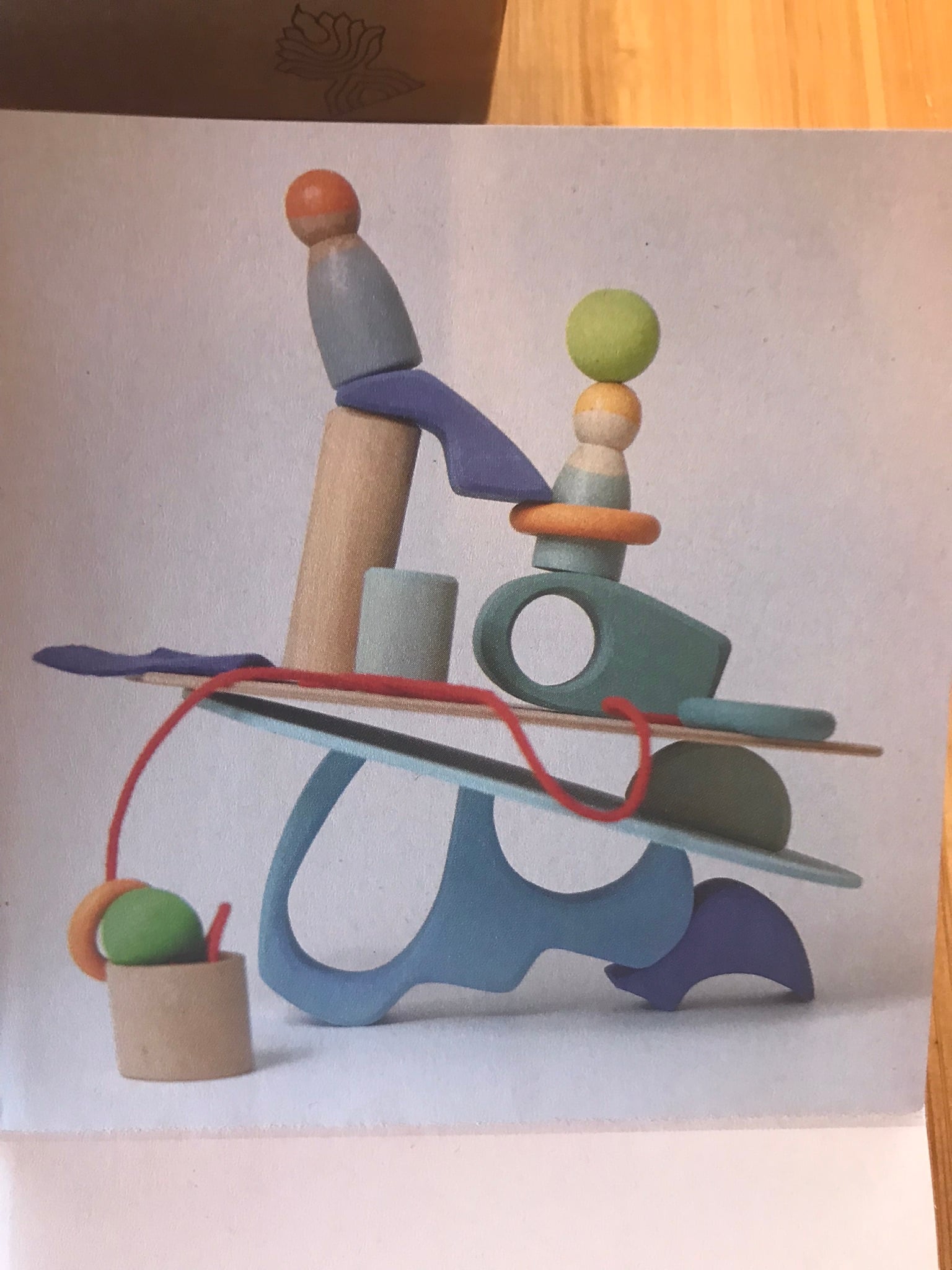 水色のボード、白木のボード、子ども2人、オーガニックシェイプスのような変形の積み木、