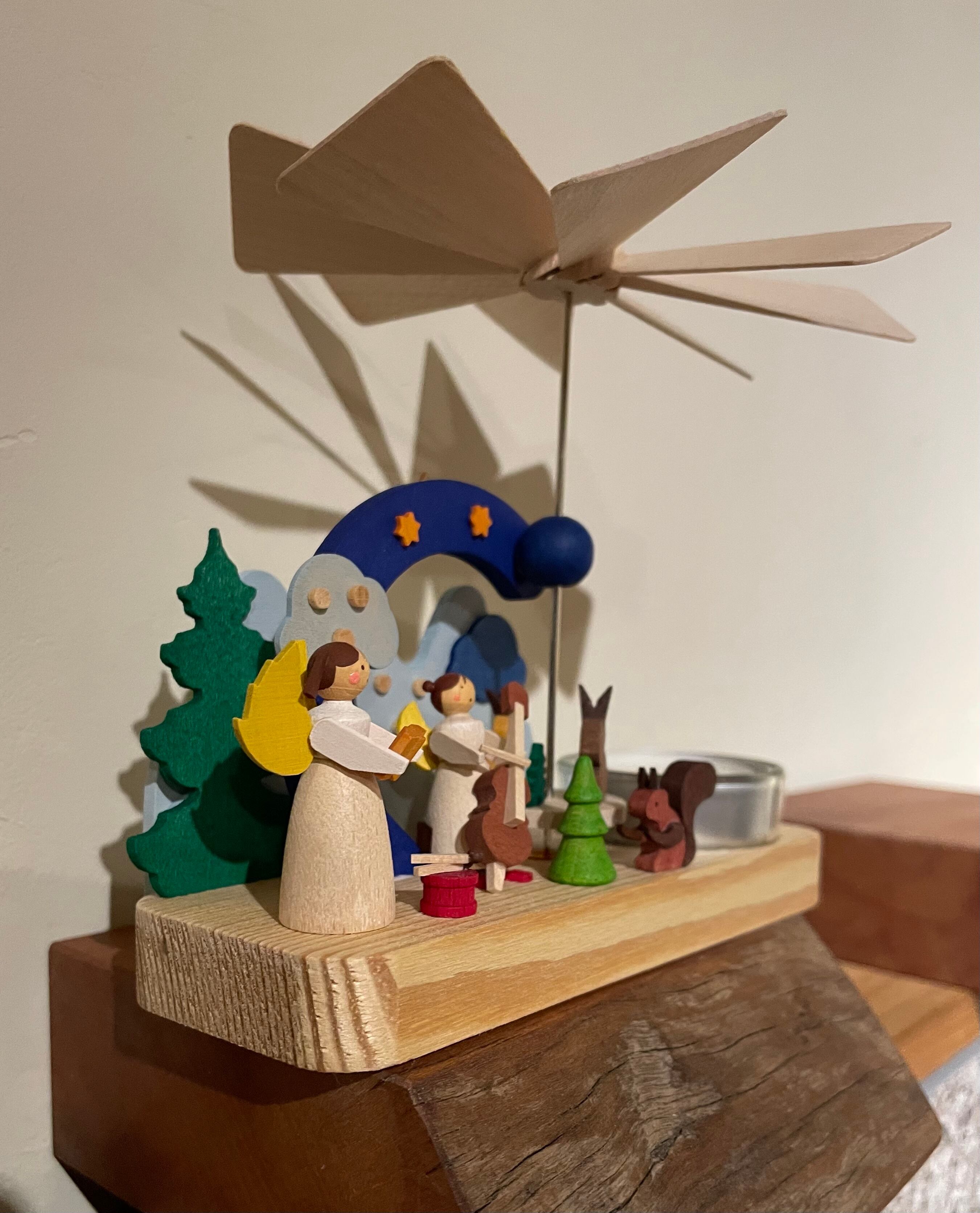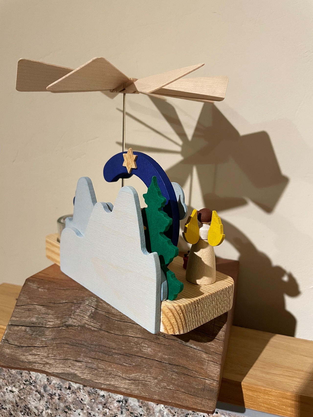 細かい細工と美しい着色のウインドミル。キャンドルをつけると羽が軽やかに回ります。